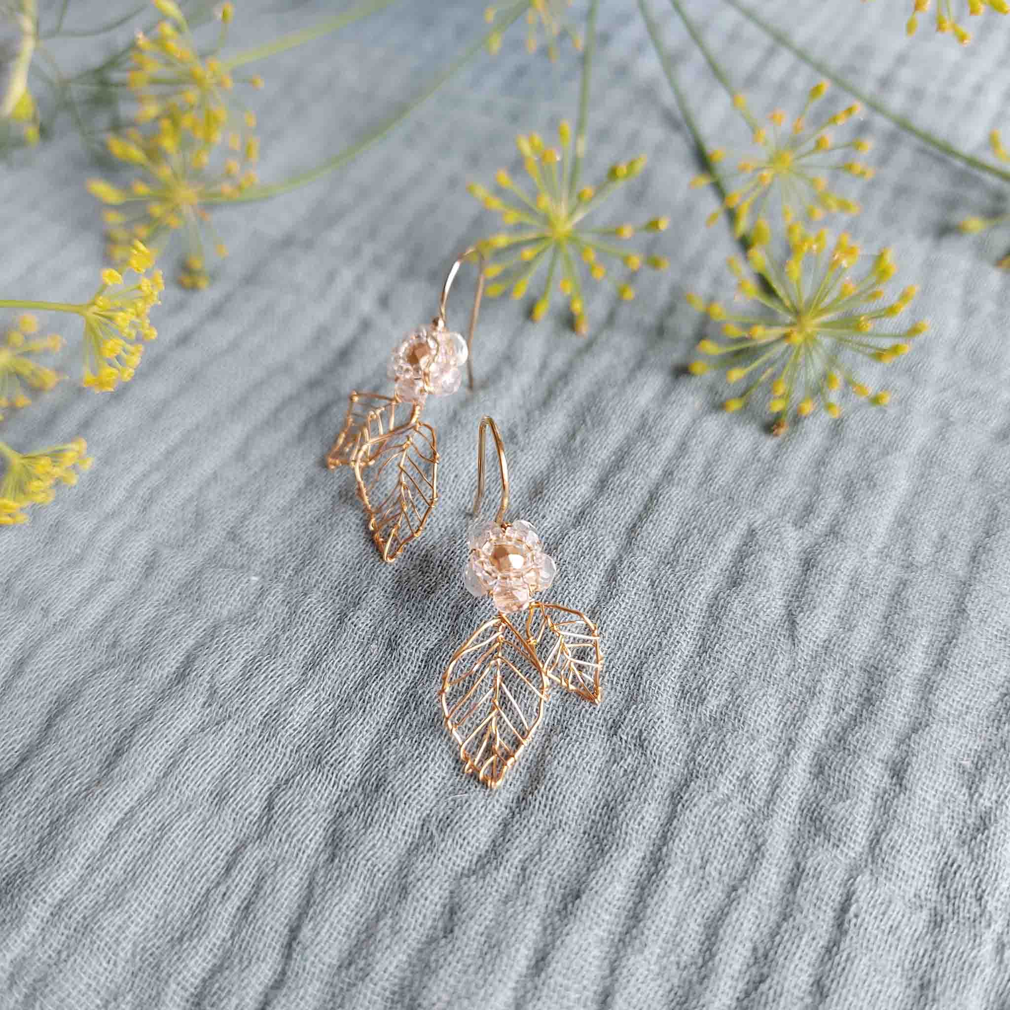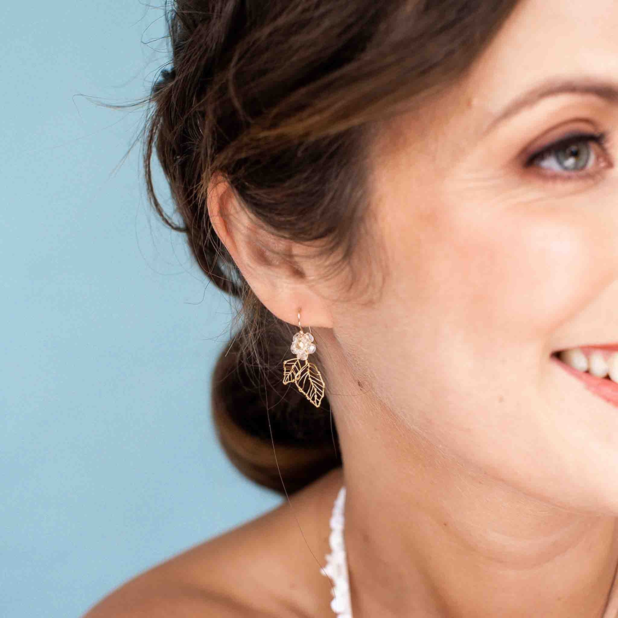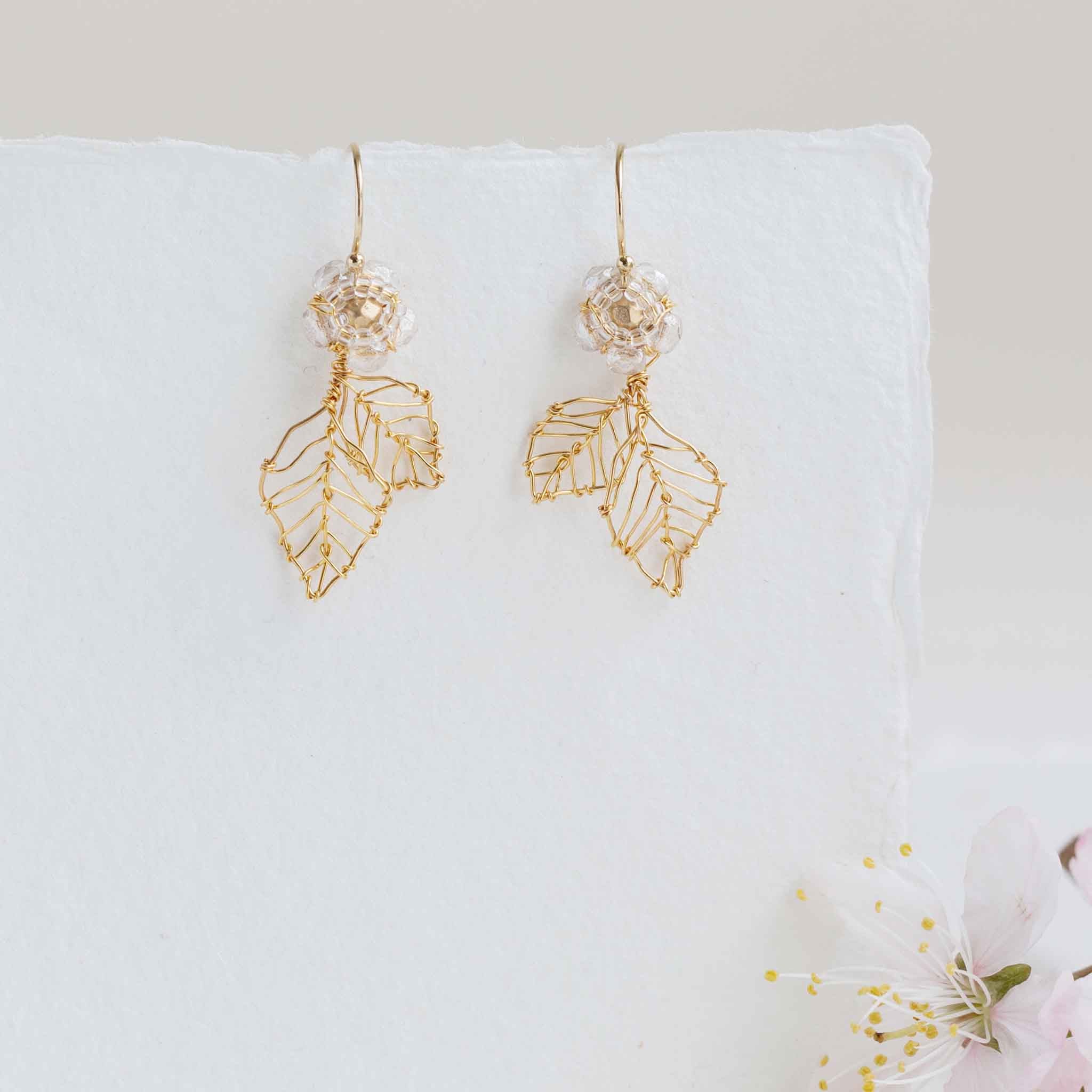 Handmade wedding earrings gold plated wire, embellished with handmade wire leaves and tiny beaded flowers.
