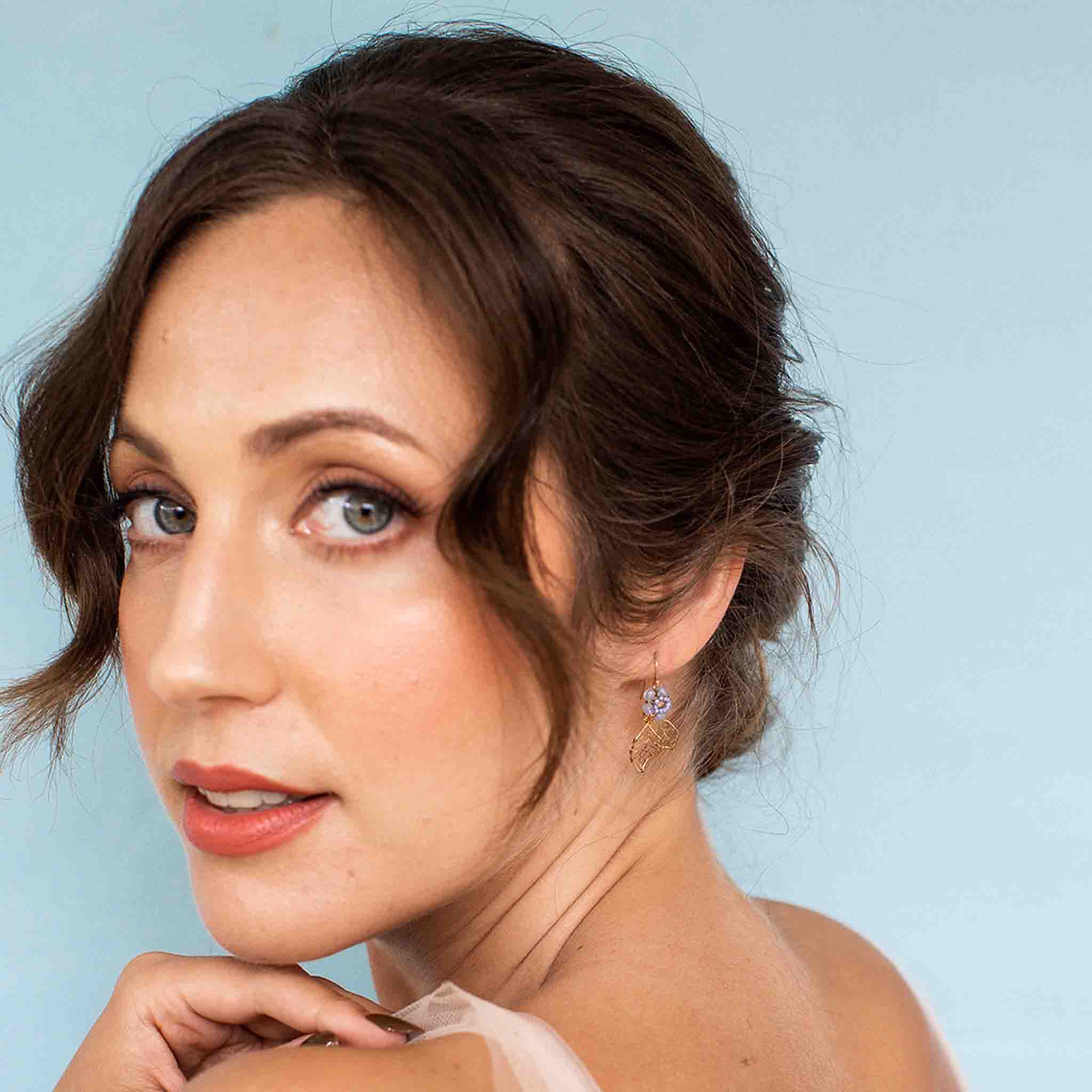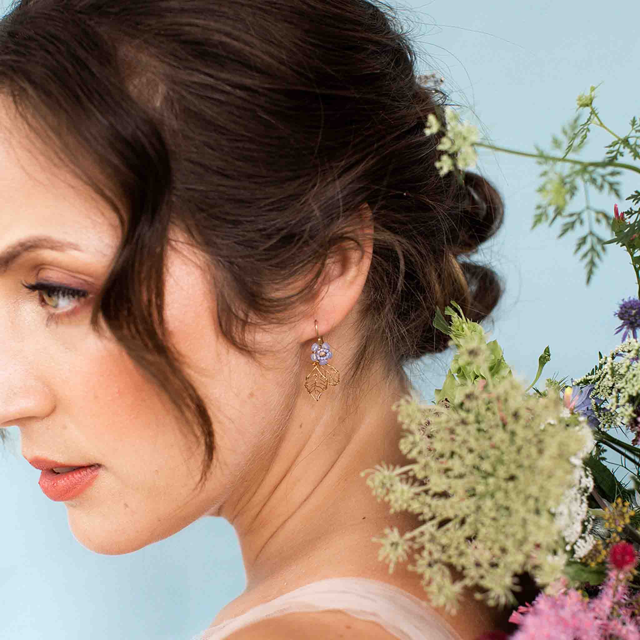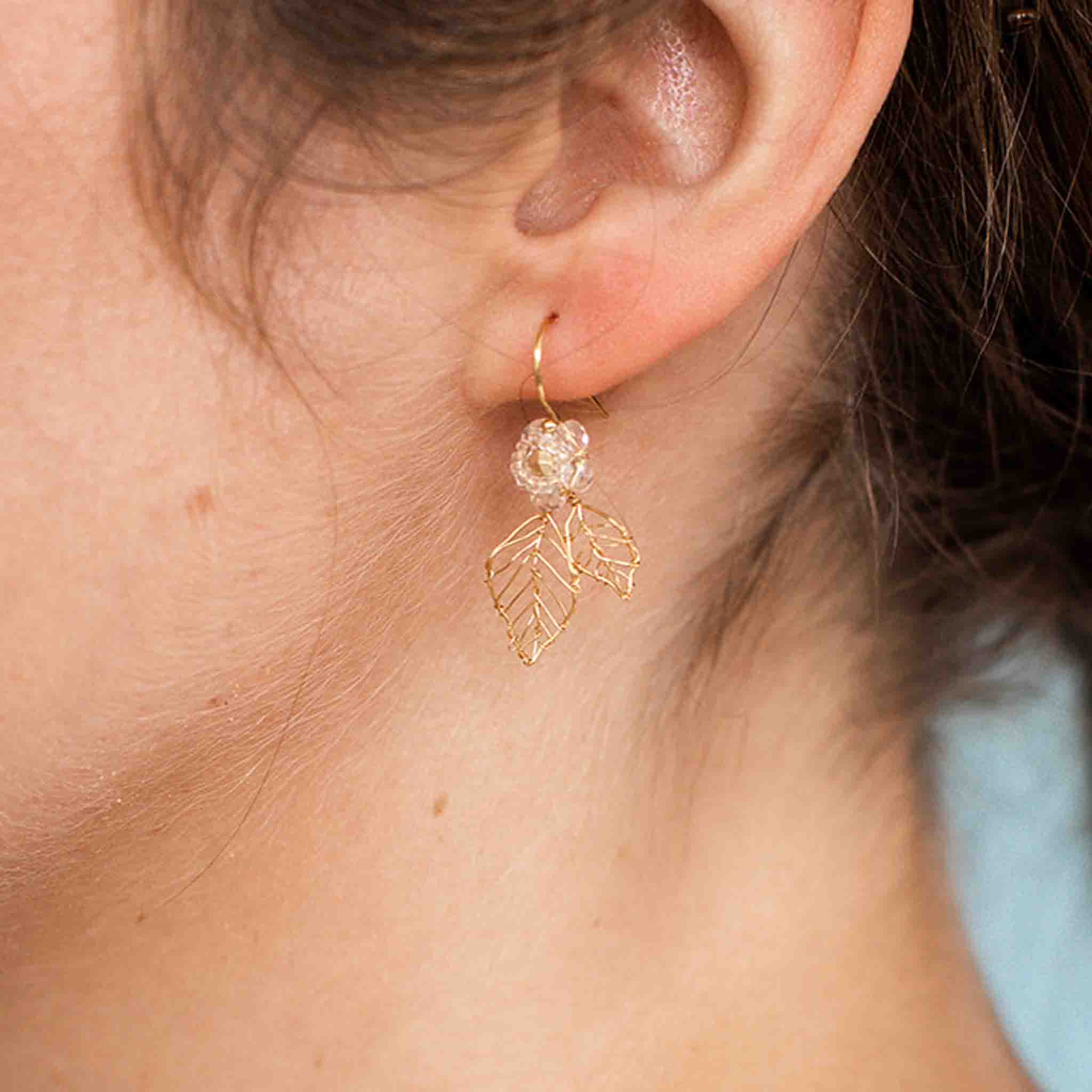 Handmade wedding earrings gold plated wire, embellished with handmade wire leaves and tiny beaded flowers.