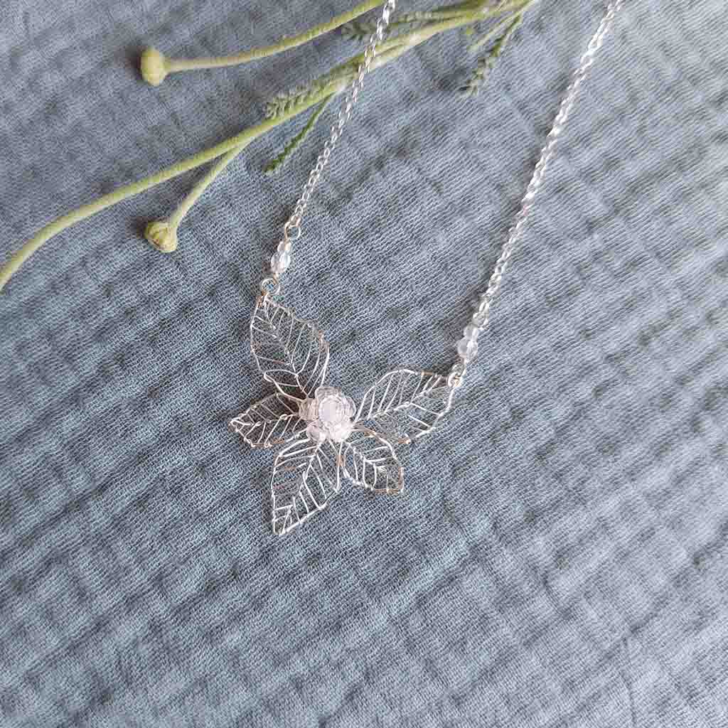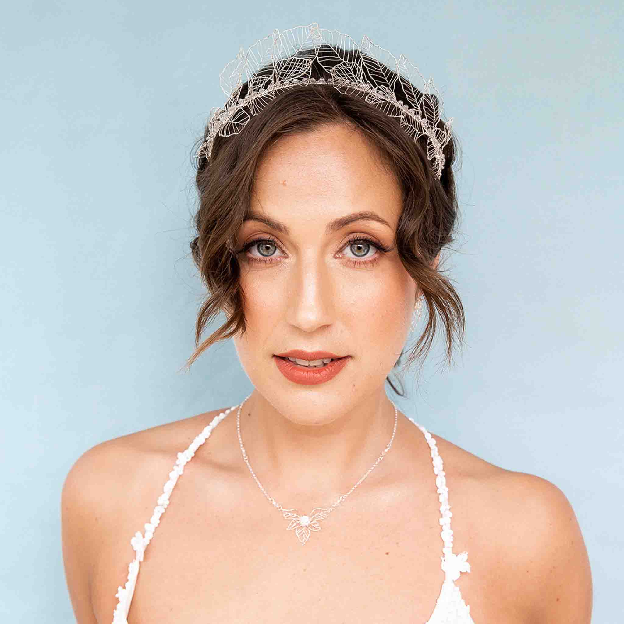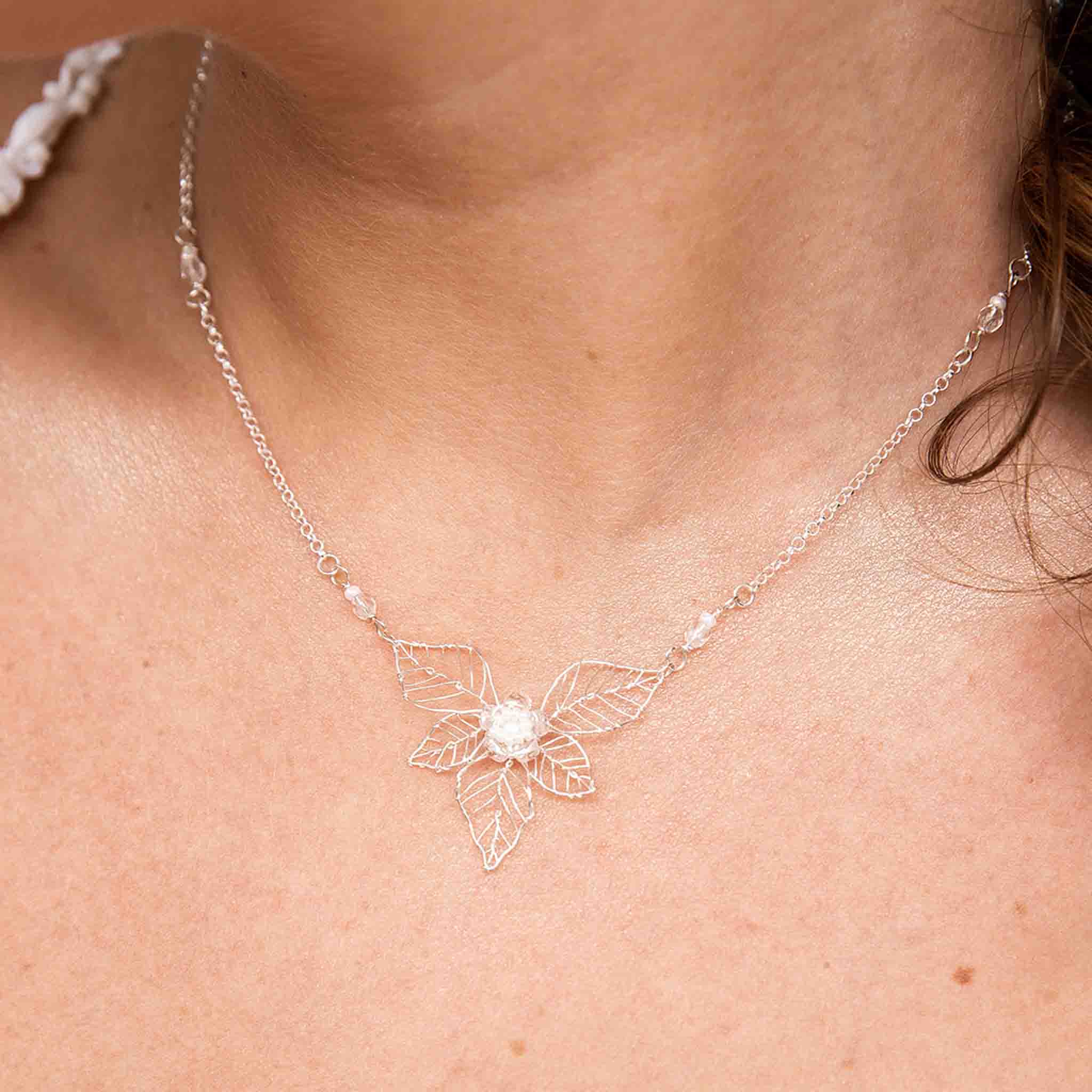 A delicate, subtle wedding necklace with detailed handmade wire leaves with glass bead embellishment to catch the light.