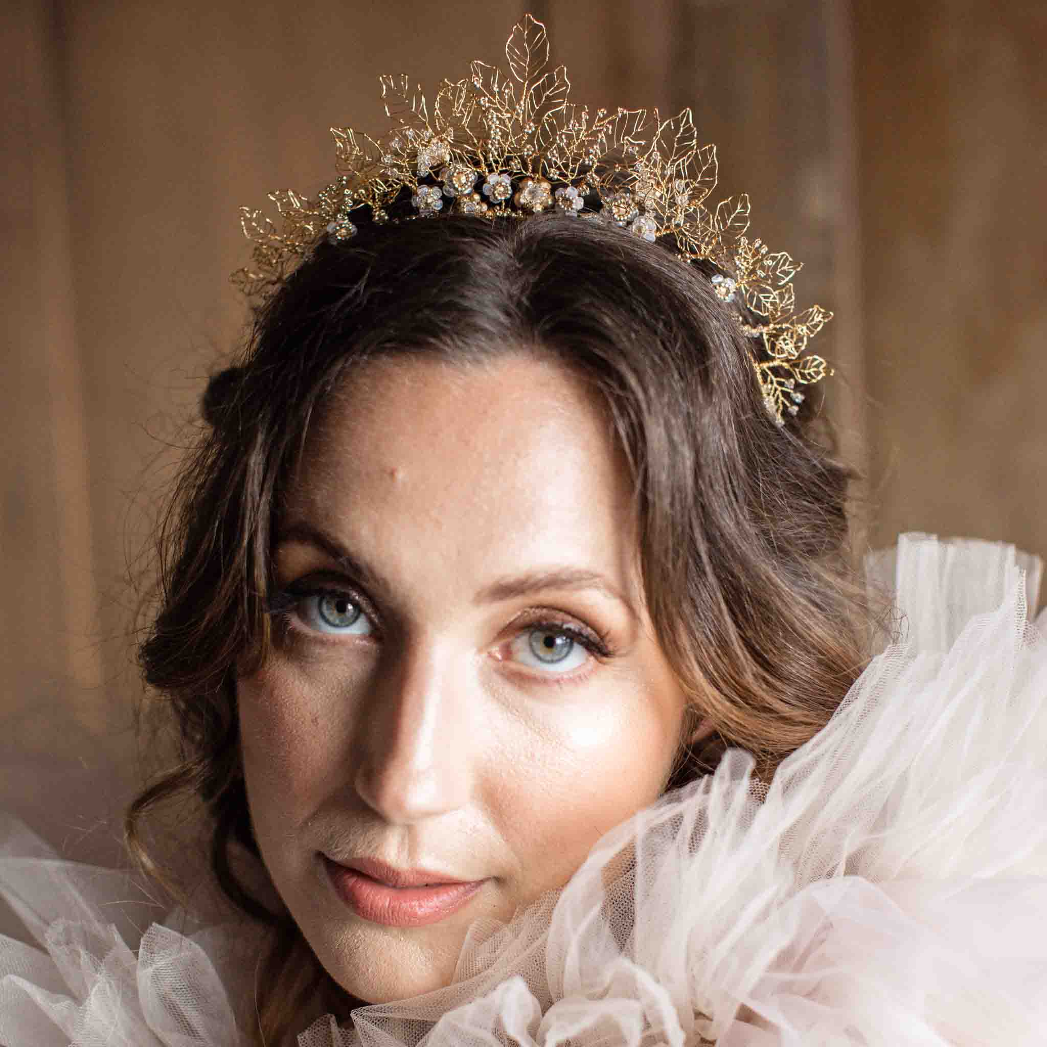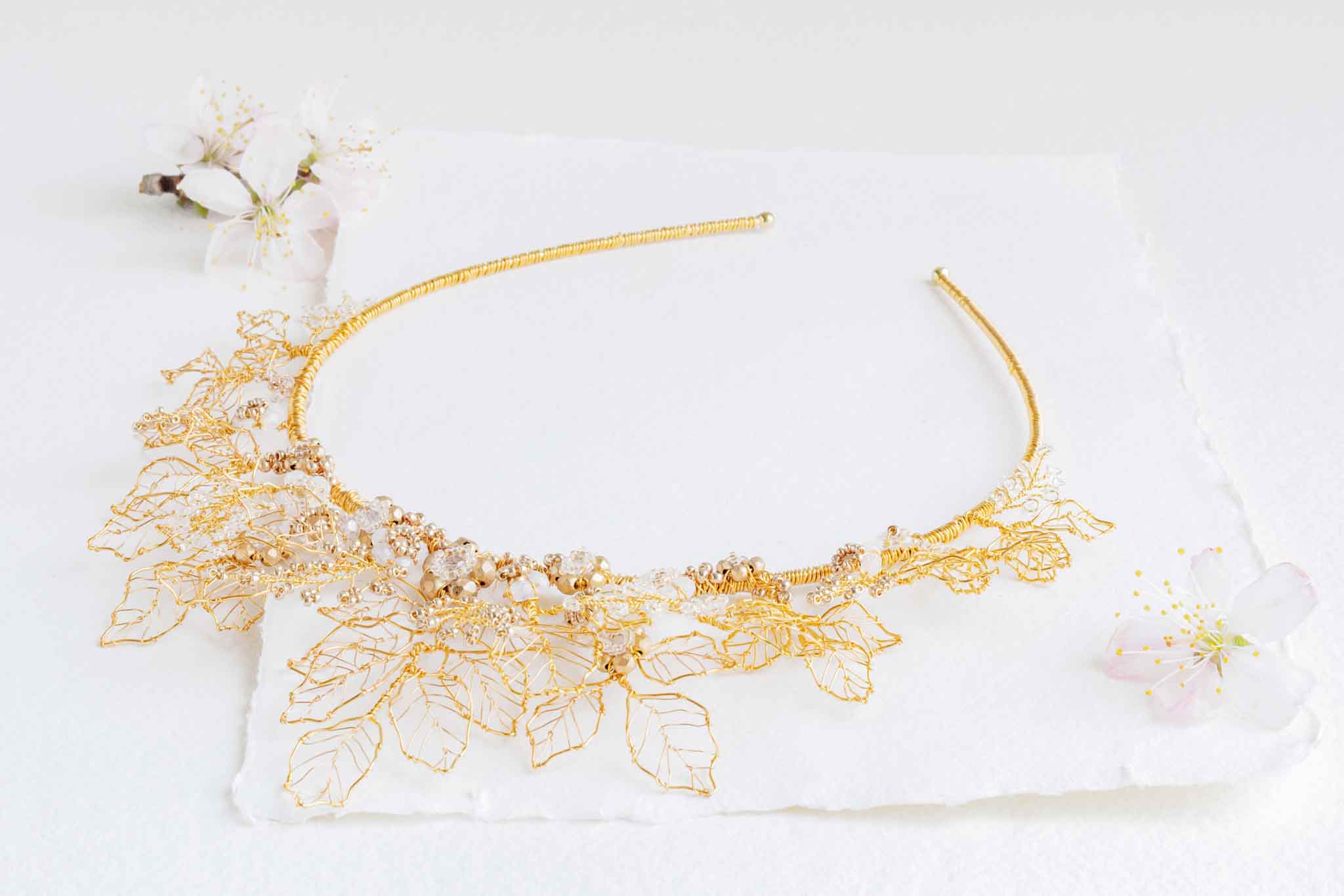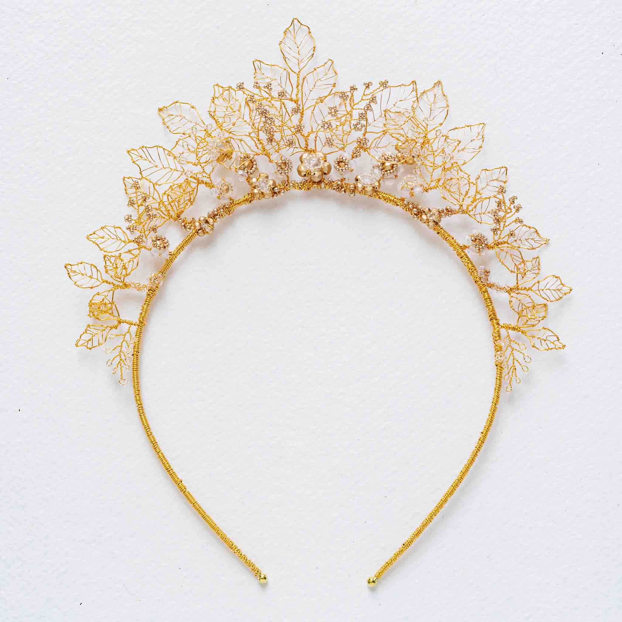 A detailed beaded bridal crown with handmade wire leaves and  glass bead flowers.