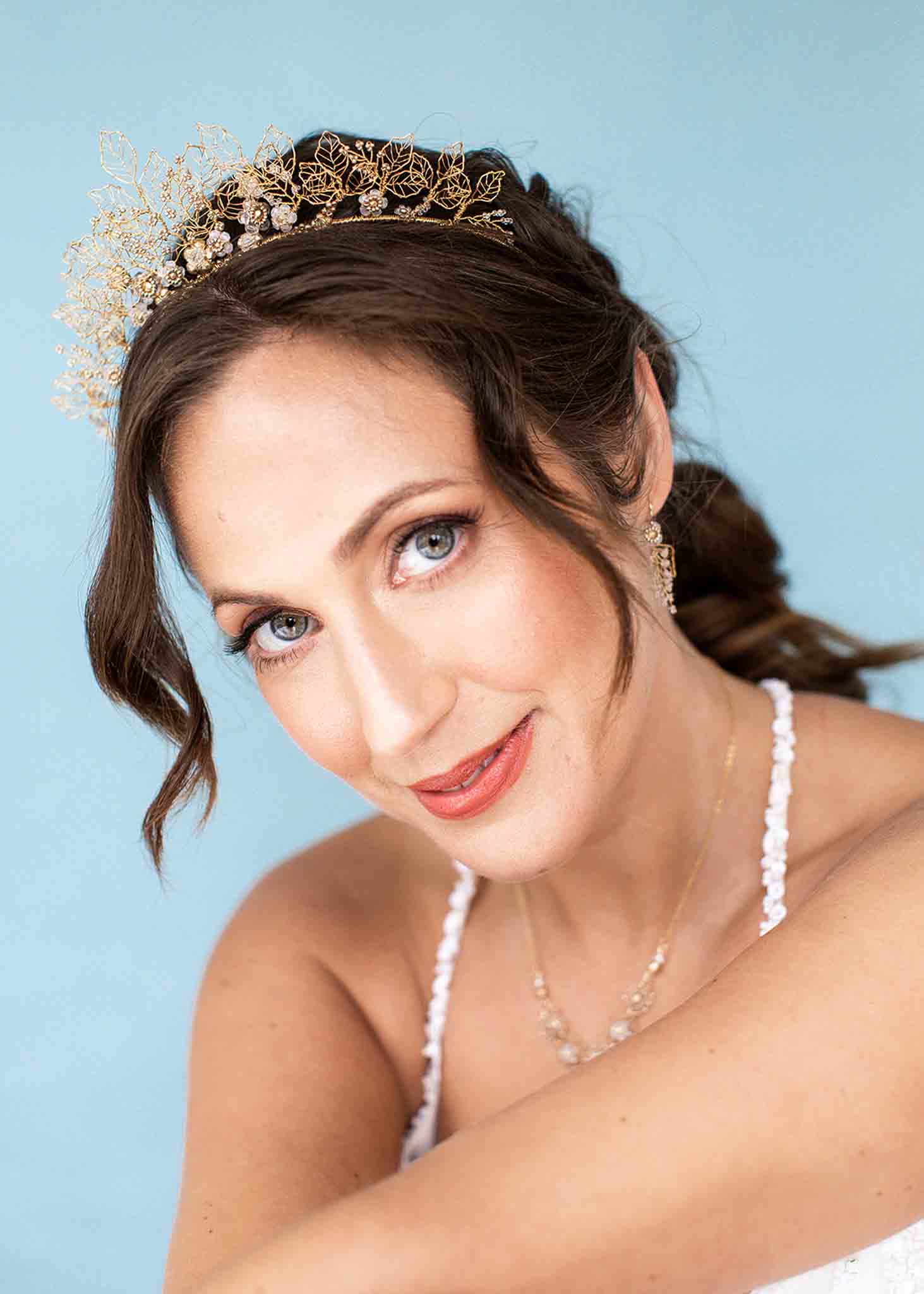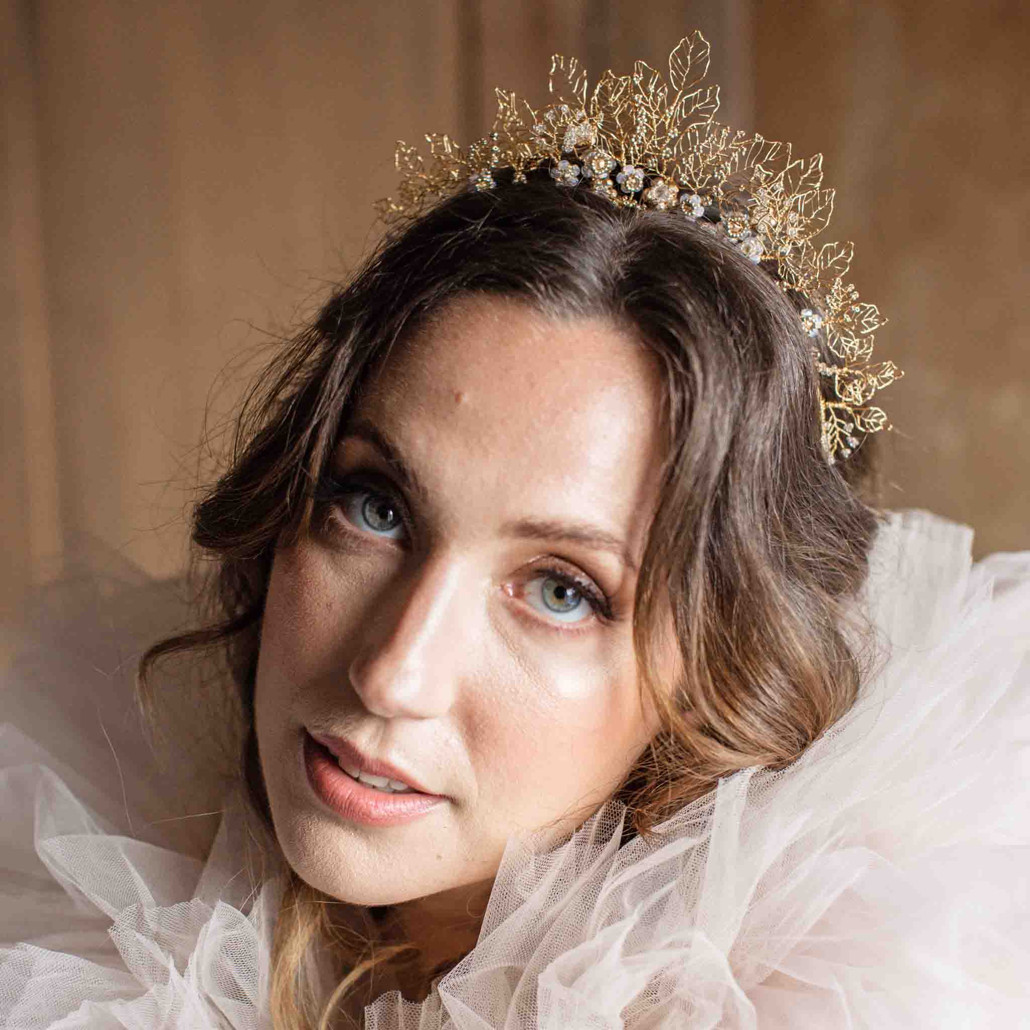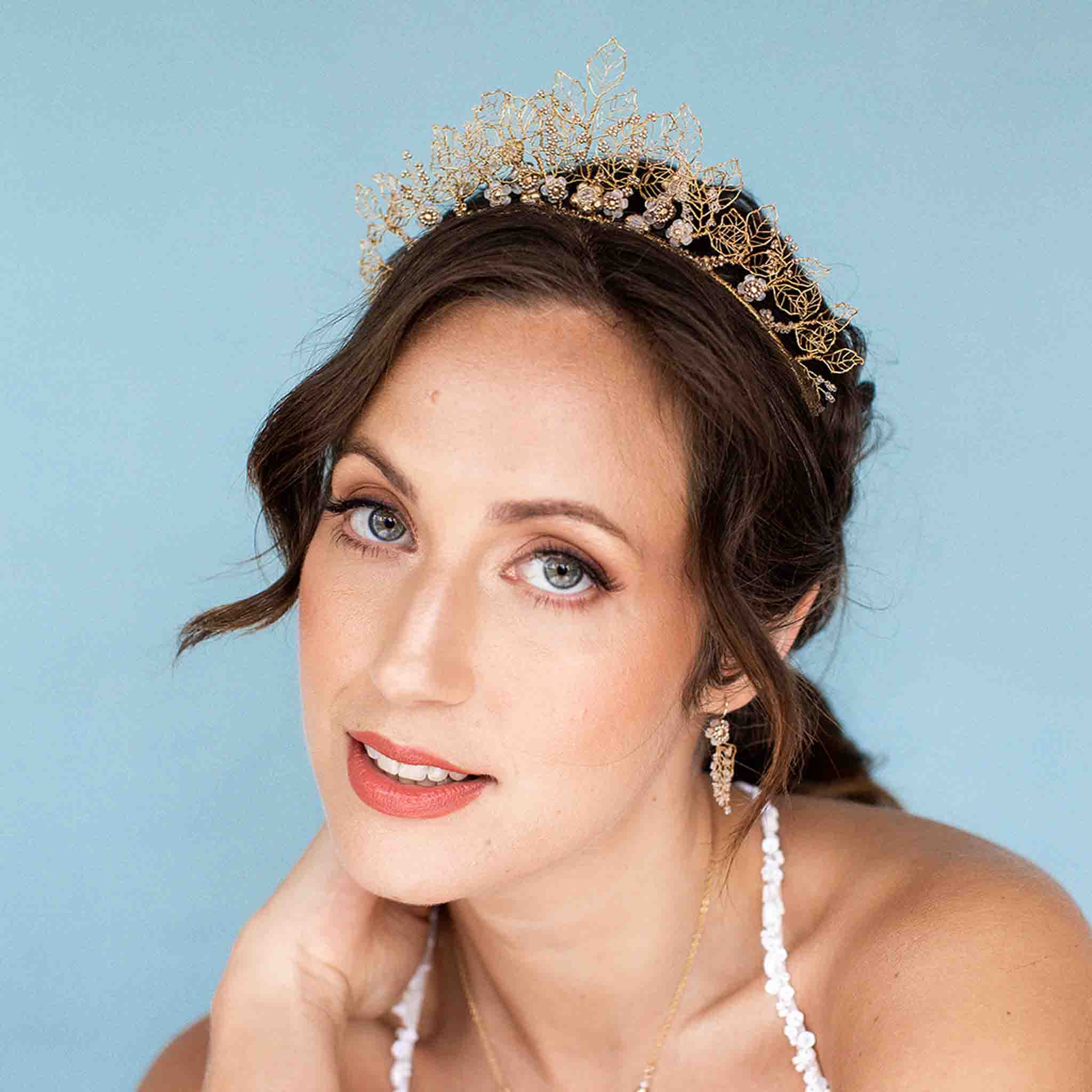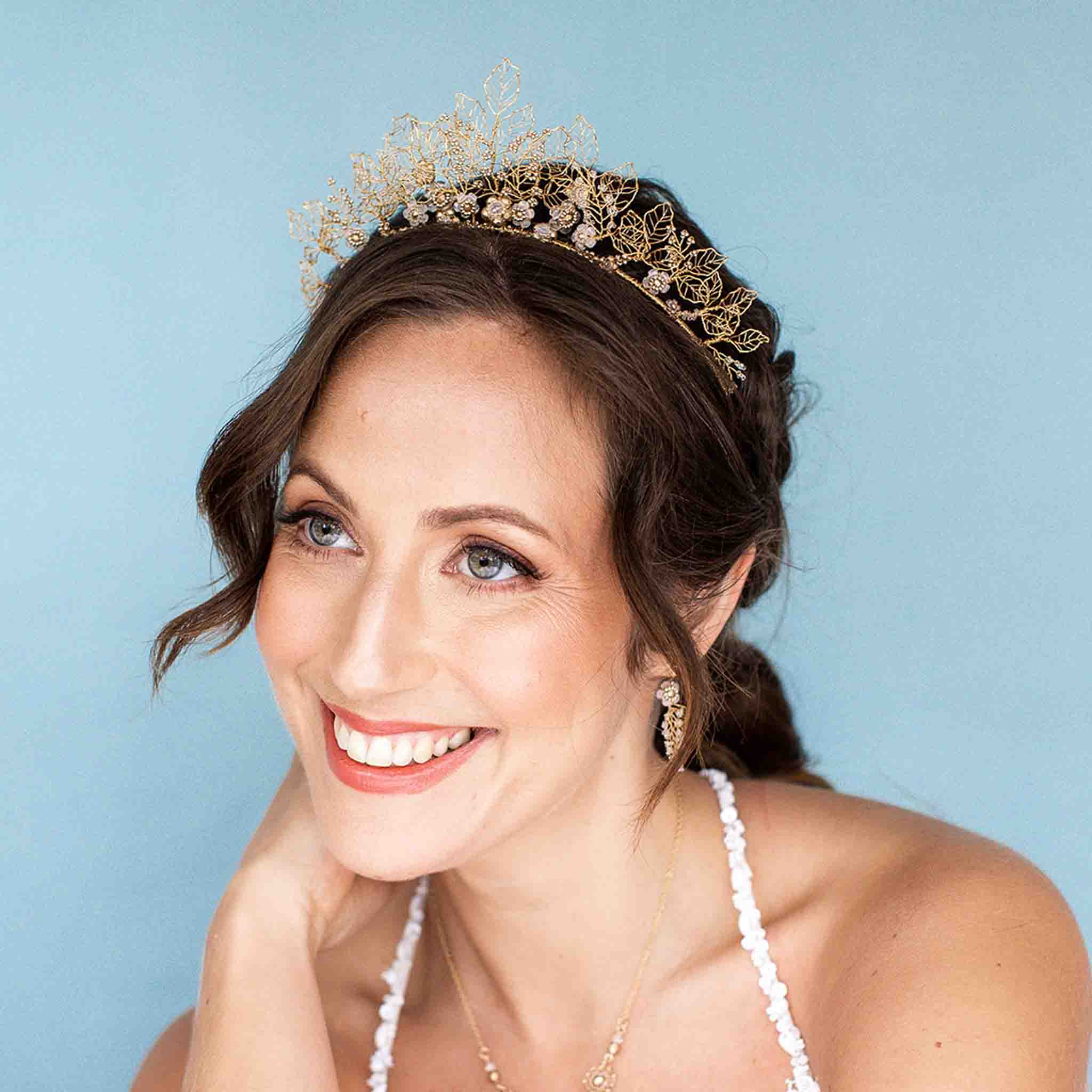 A detailed beaded bridal crown with handmade wire leaves and  glass bead flowers.