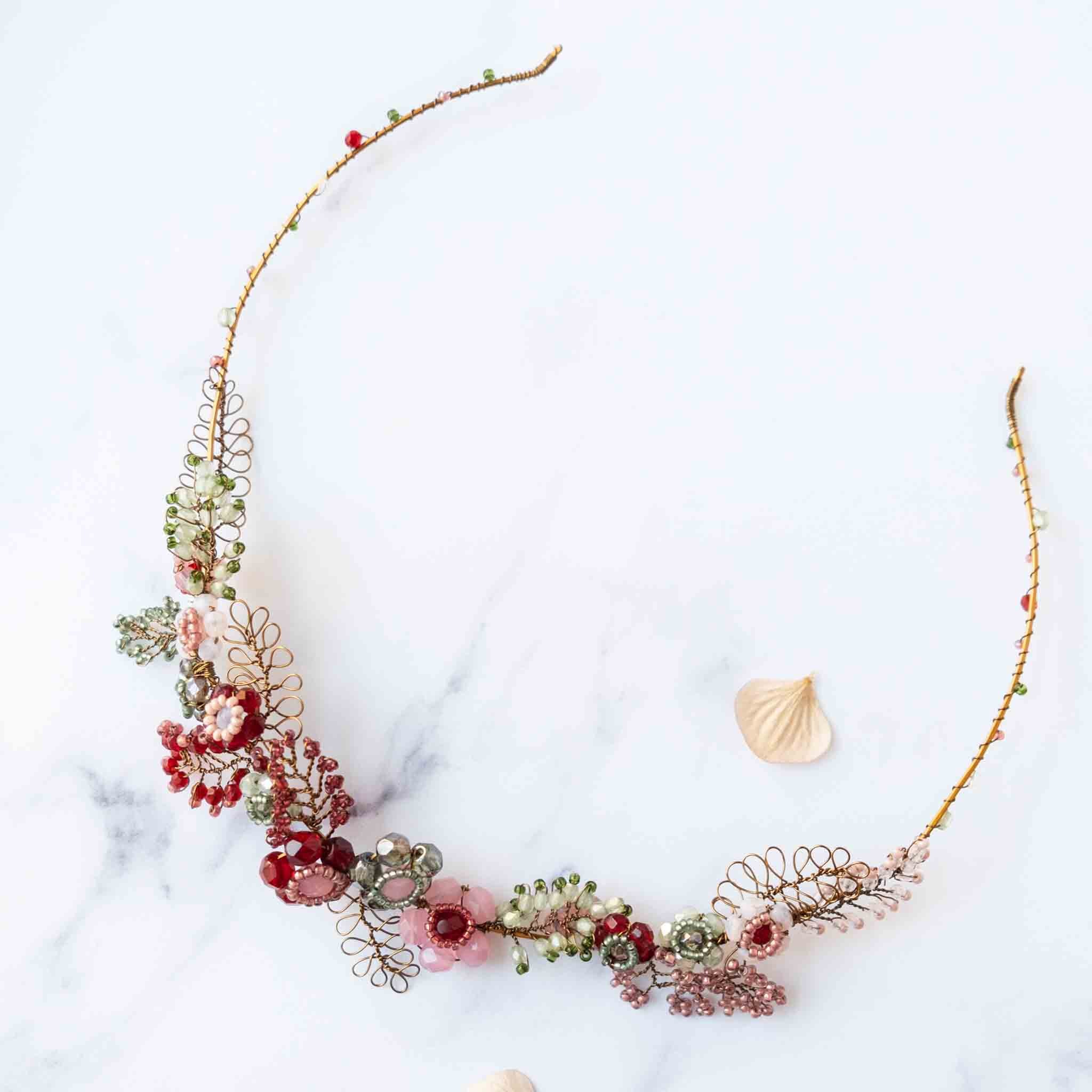 A handmade wedding headband in shades of deep red, soft pinks and subtle greens with antique bronze coloured wire base and handmade wire leaves. Inspired by a tumble of tiny flowers and plants climbing along a wall.