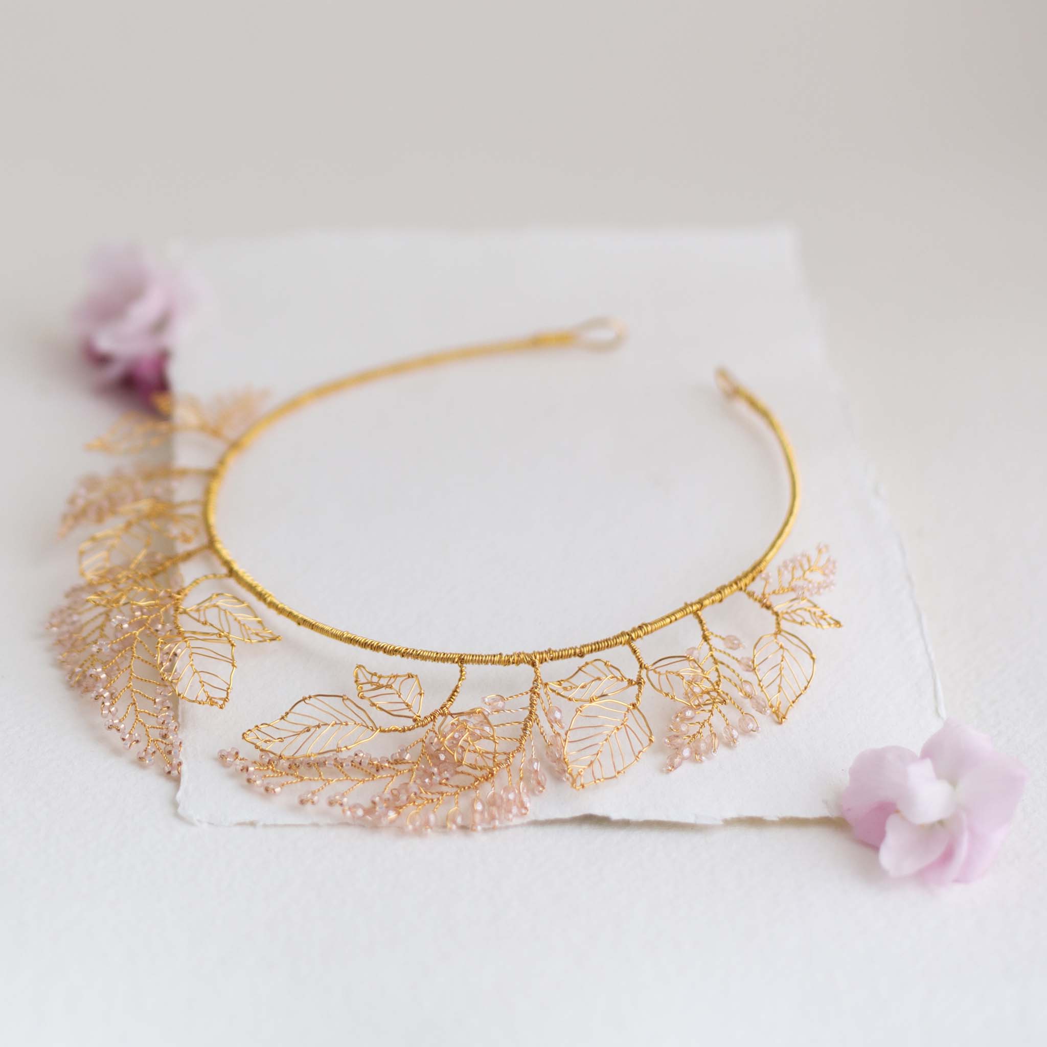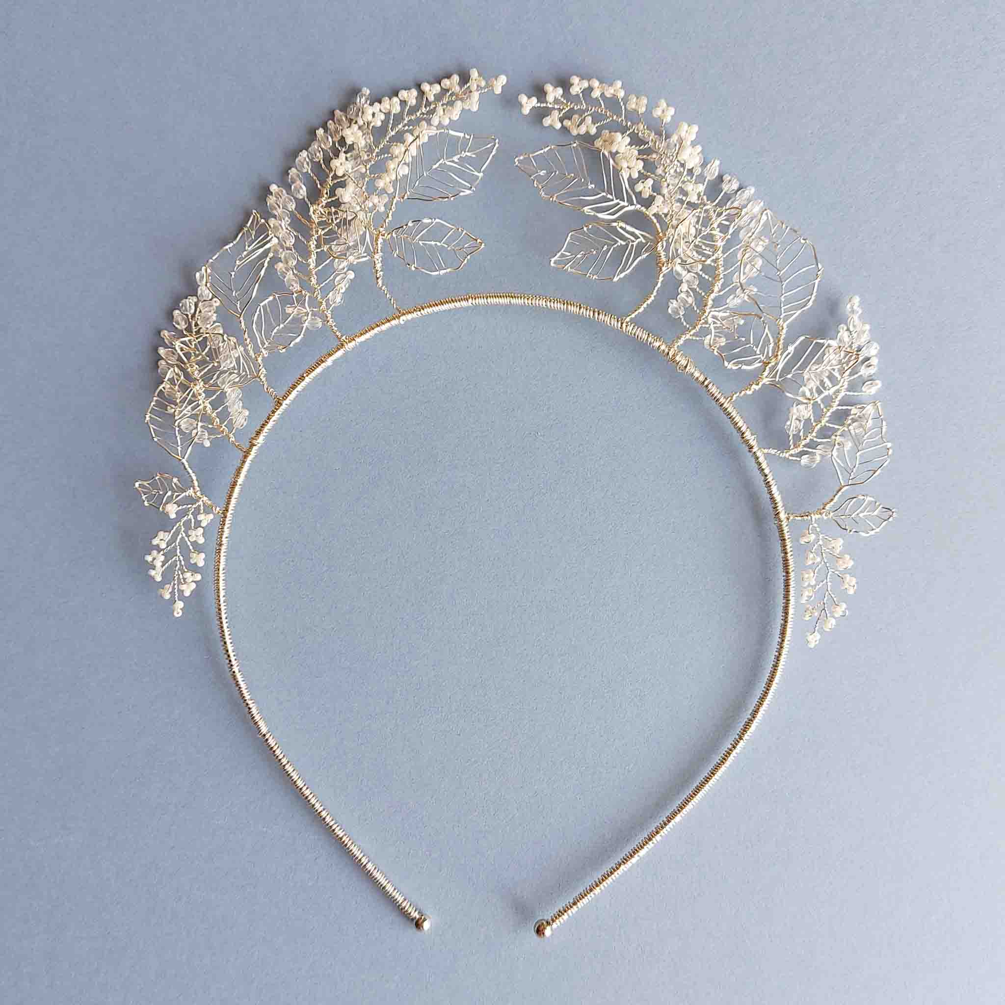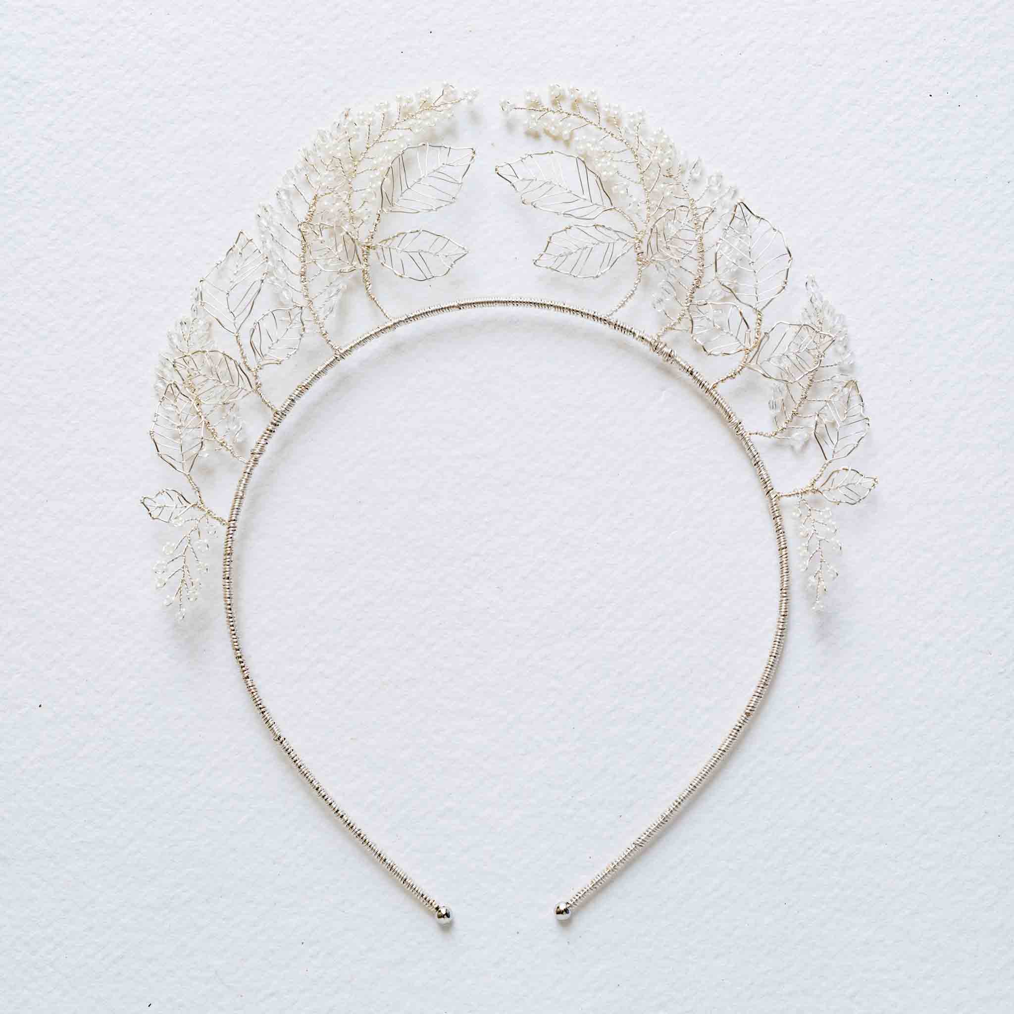 A delicate bridal crown with handmade wire leaves and beaded embellishment.