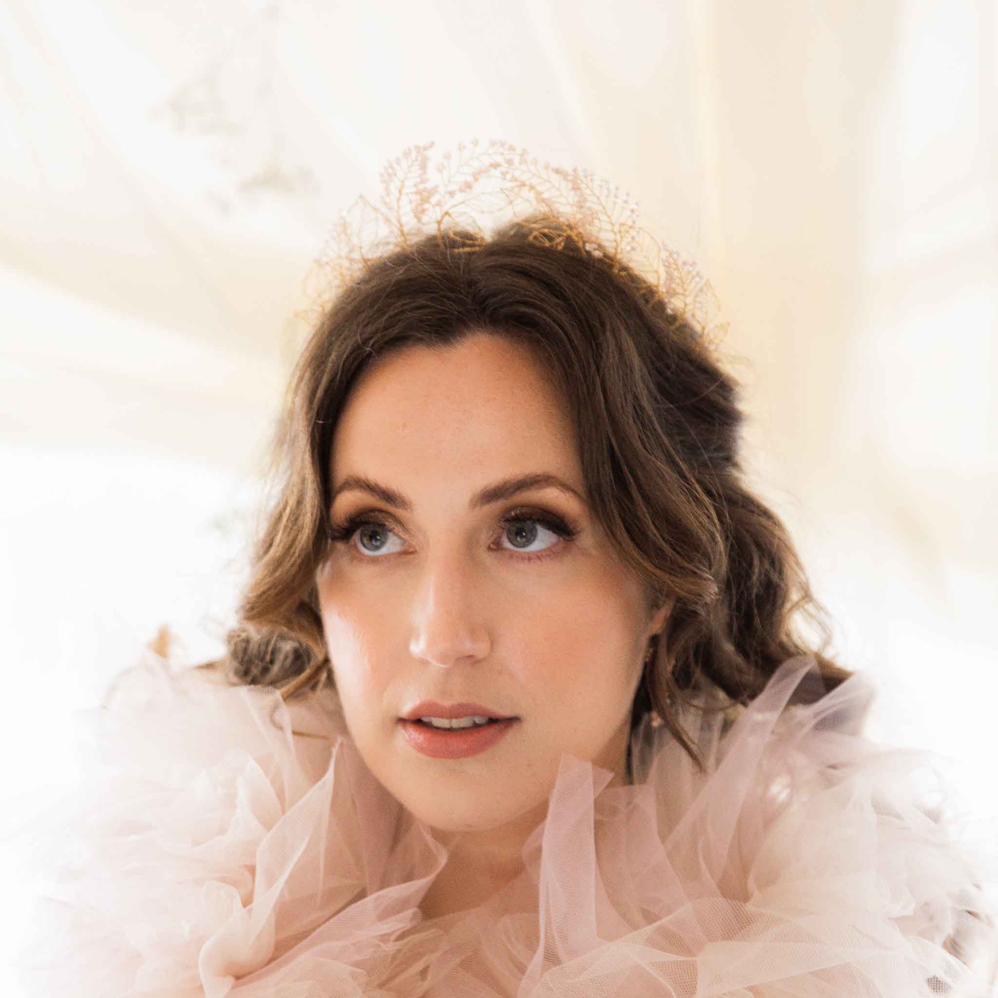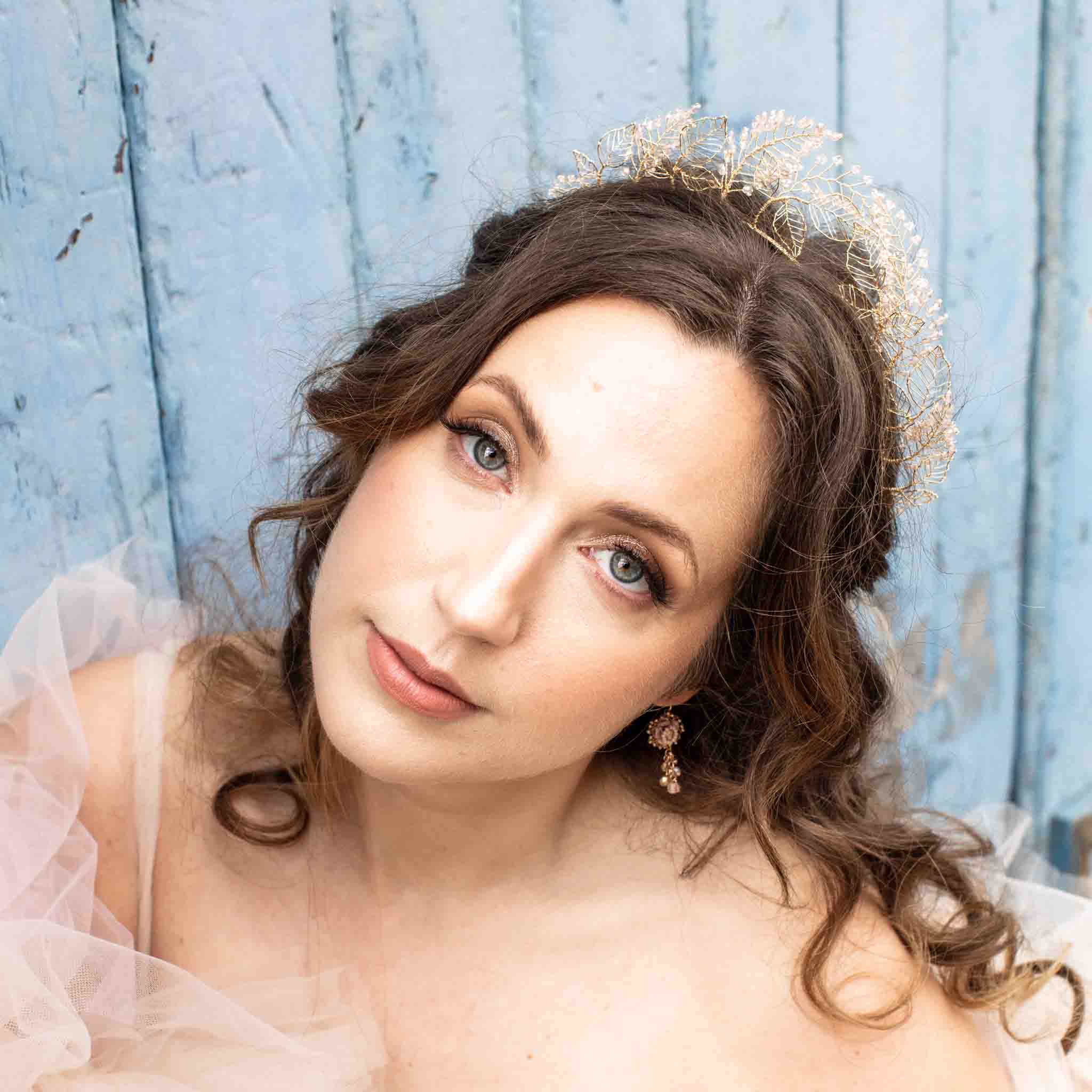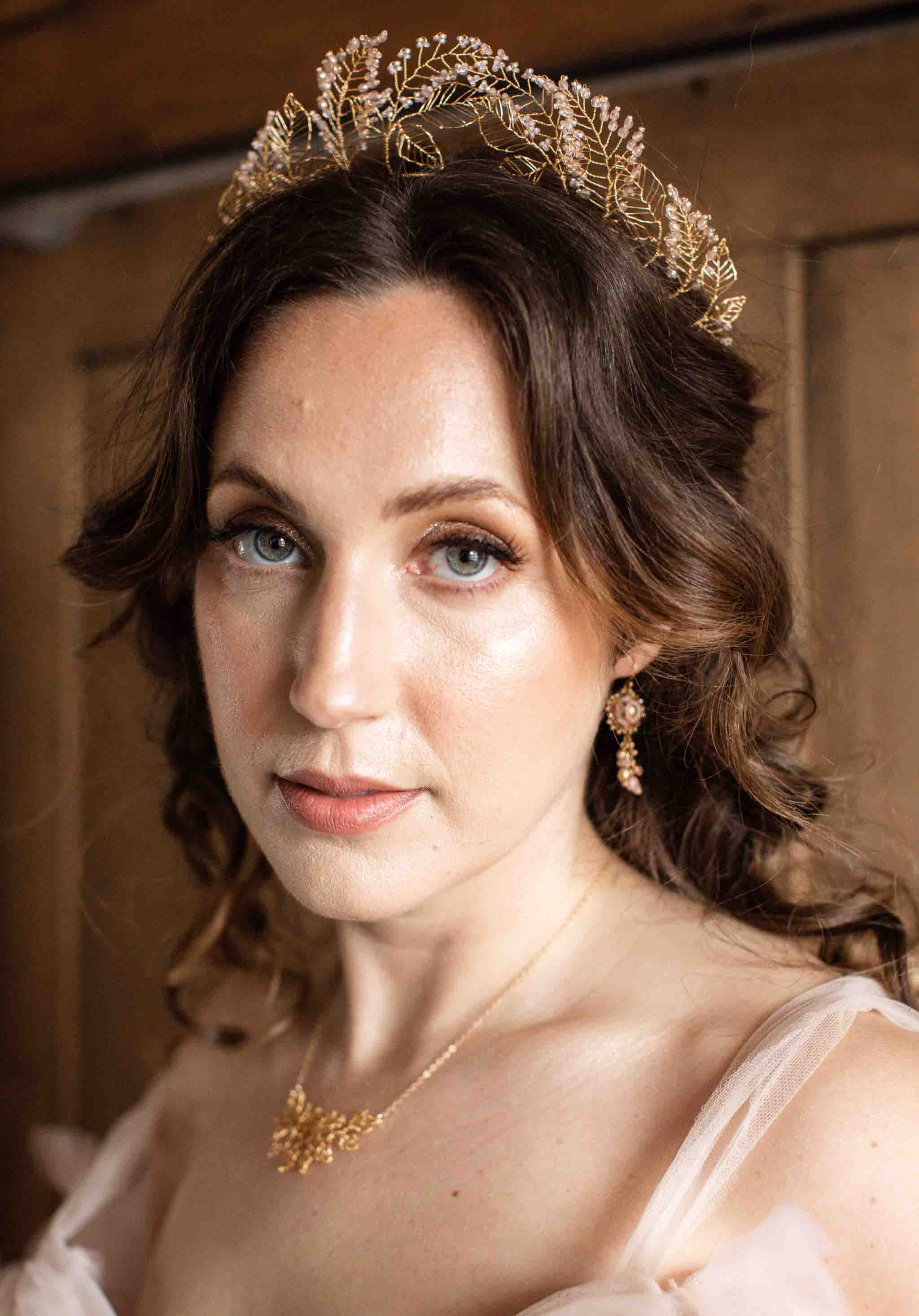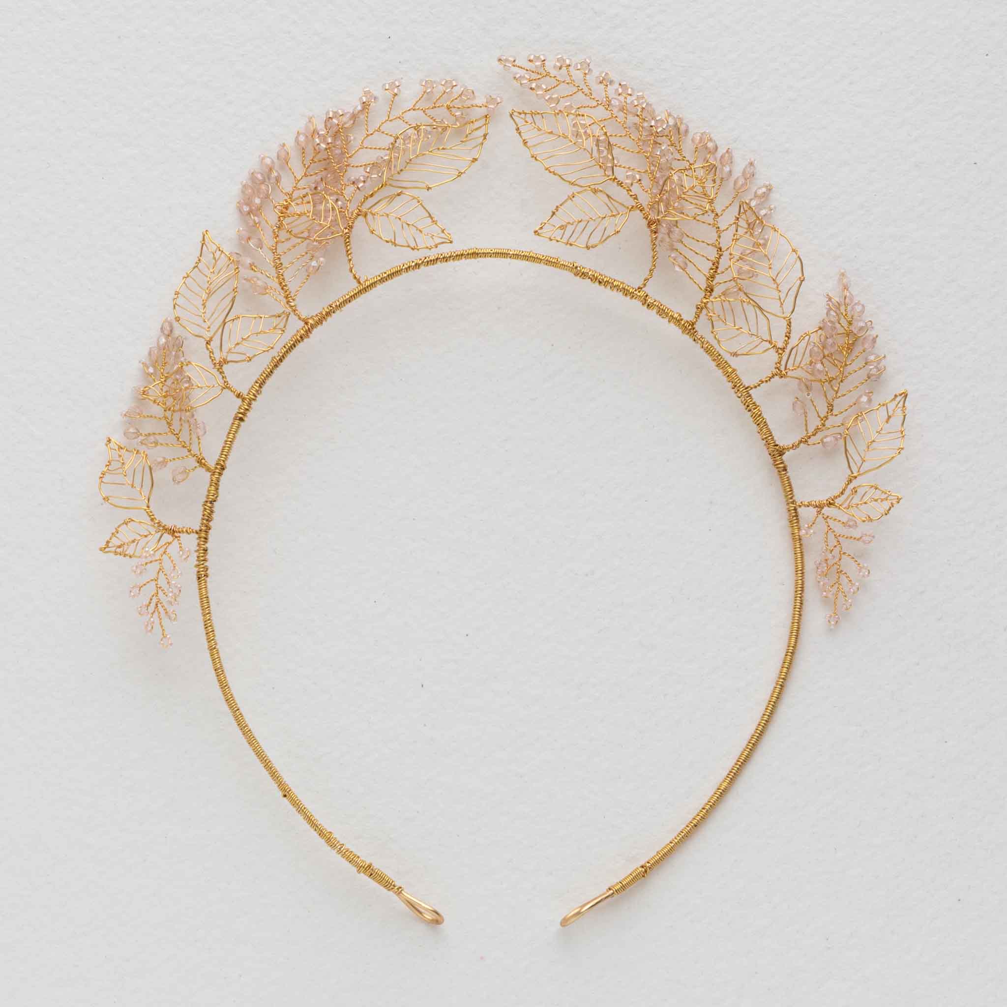 A delicate bridal crown with handmade wire leaves and beaded embellishment.