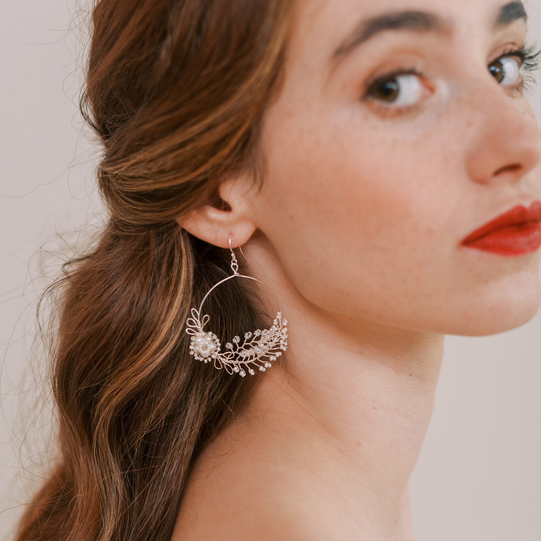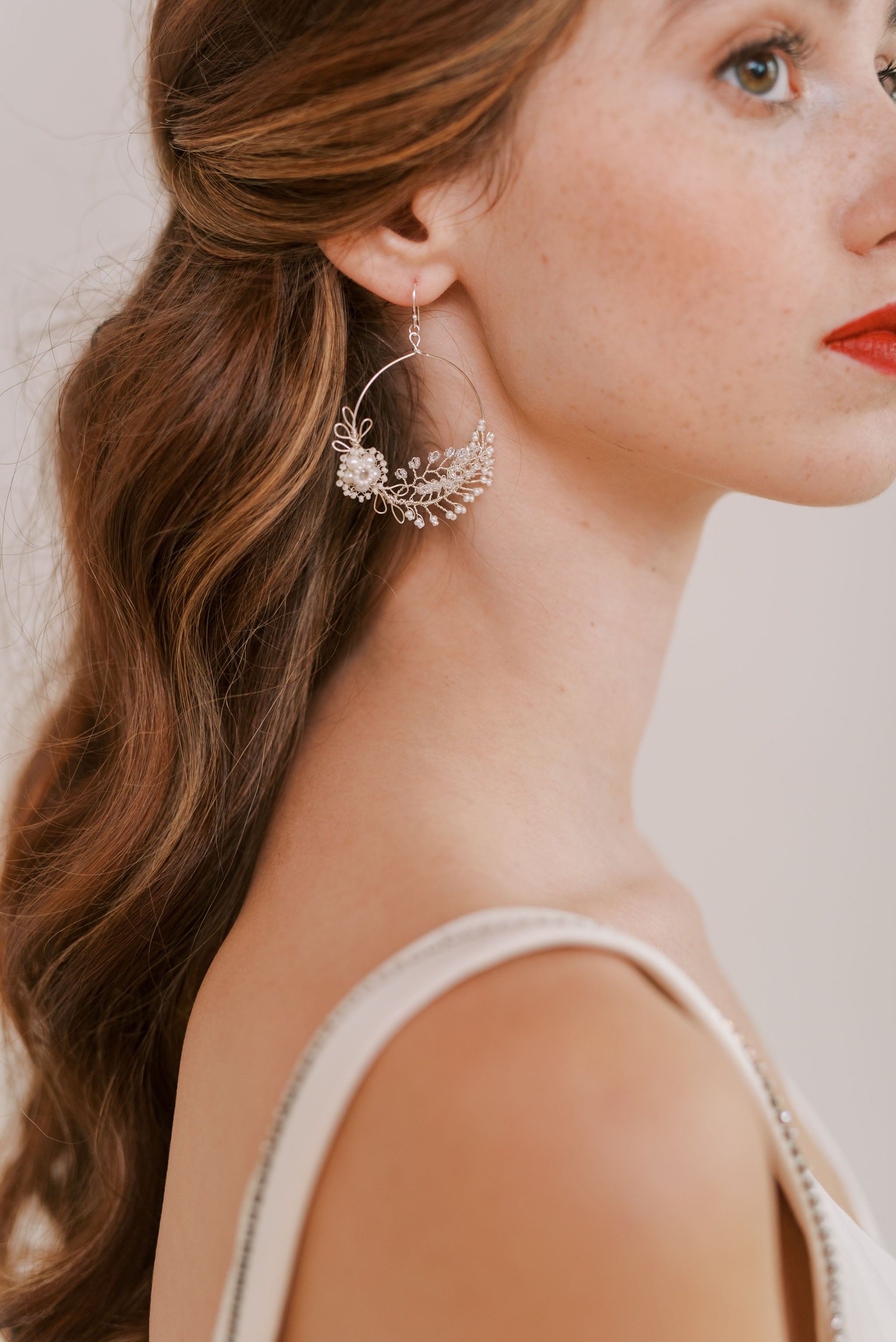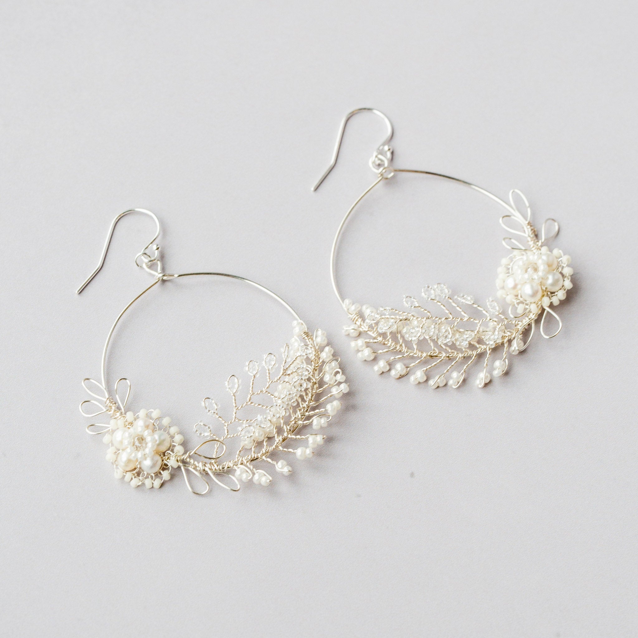 Handmade wedding statement earrings in silver or gold, embellished with tiny freshwater pearl flowers and beaded wire leaves.
