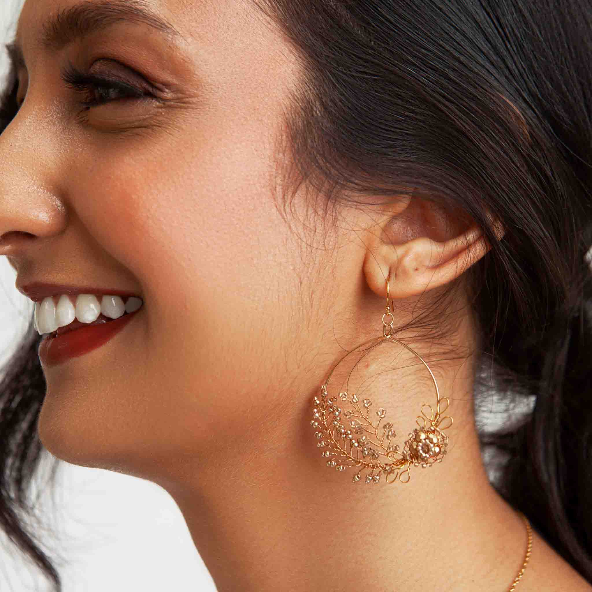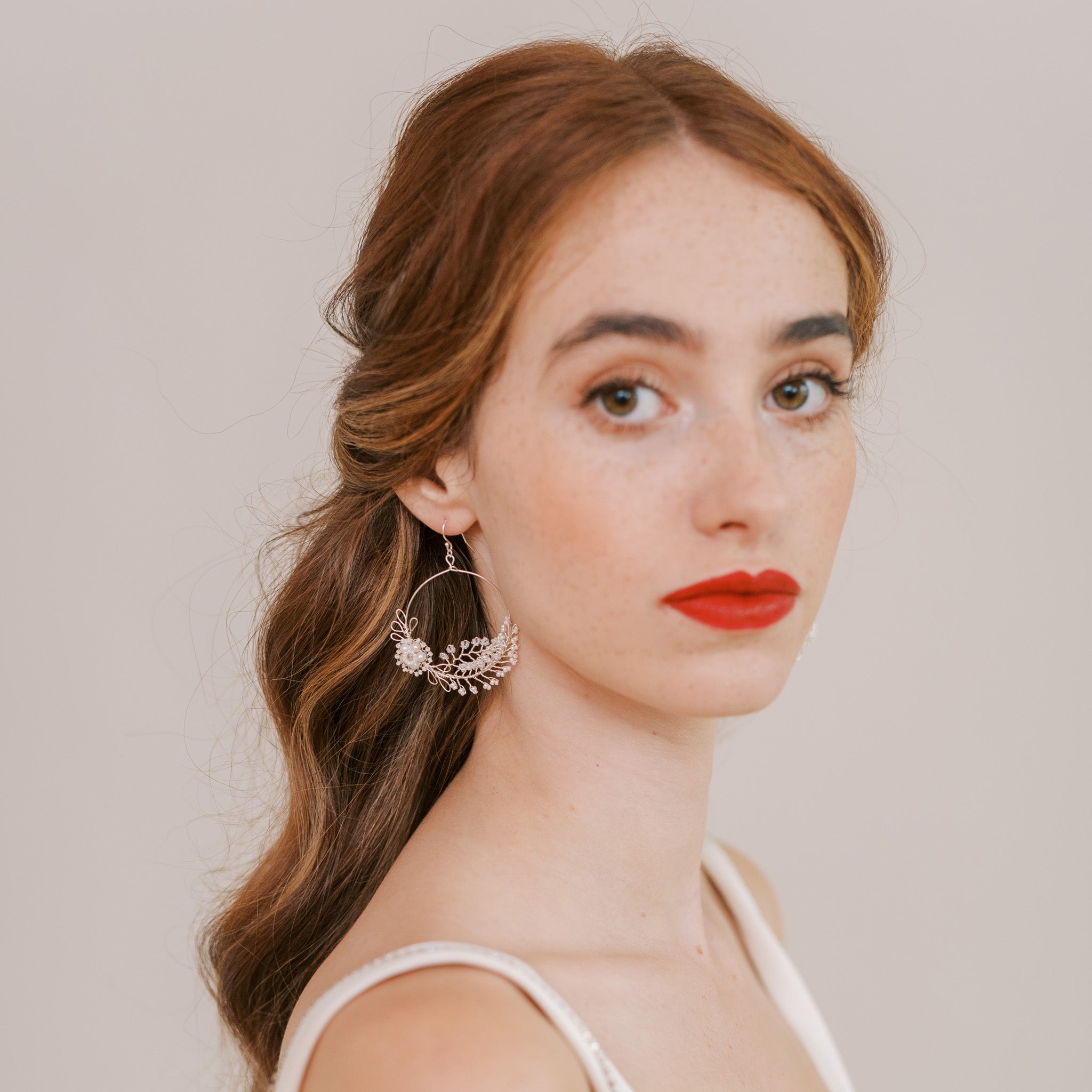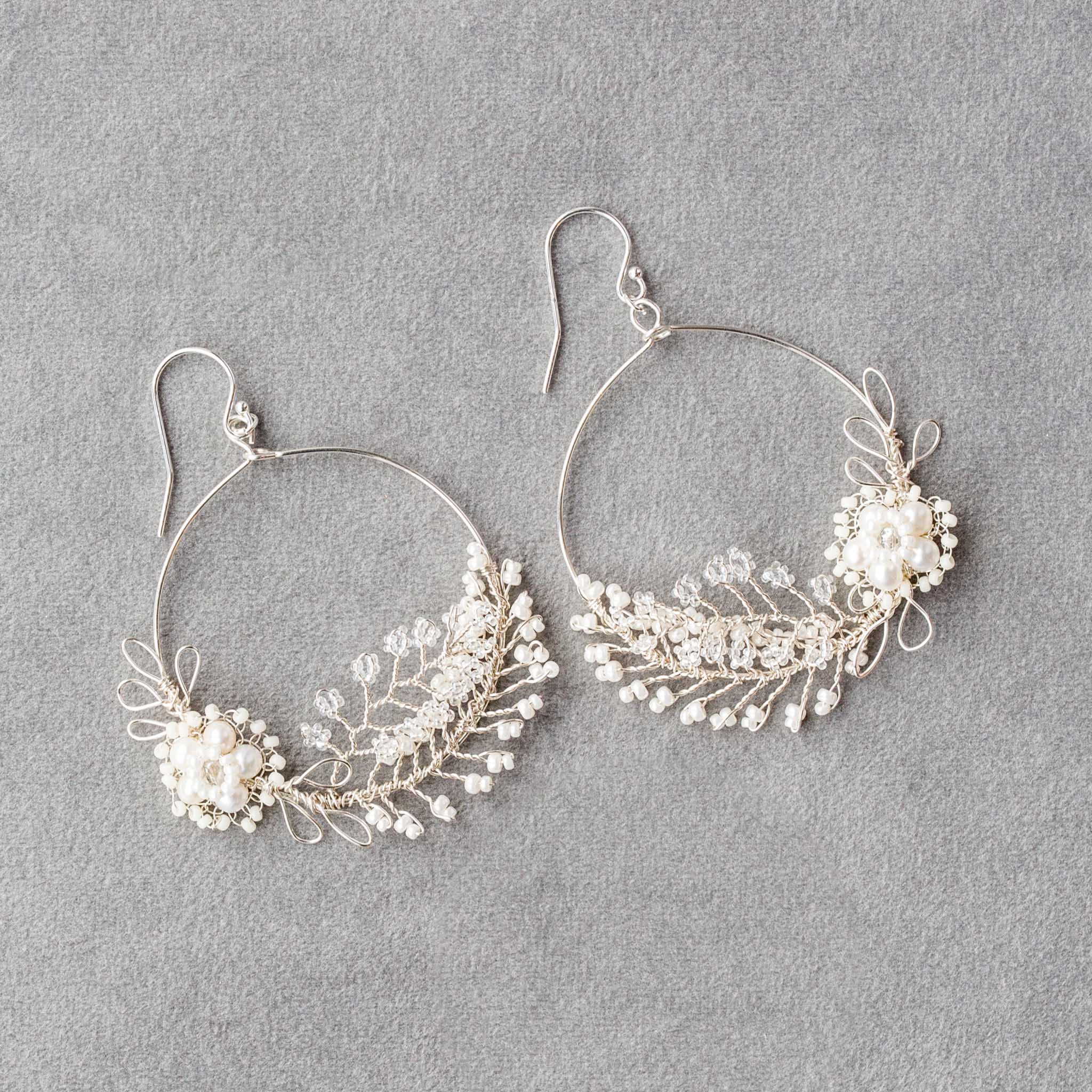 Handmade wedding statement earrings in silver or gold, embellished with tiny freshwater pearl flowers and beaded wire leaves.