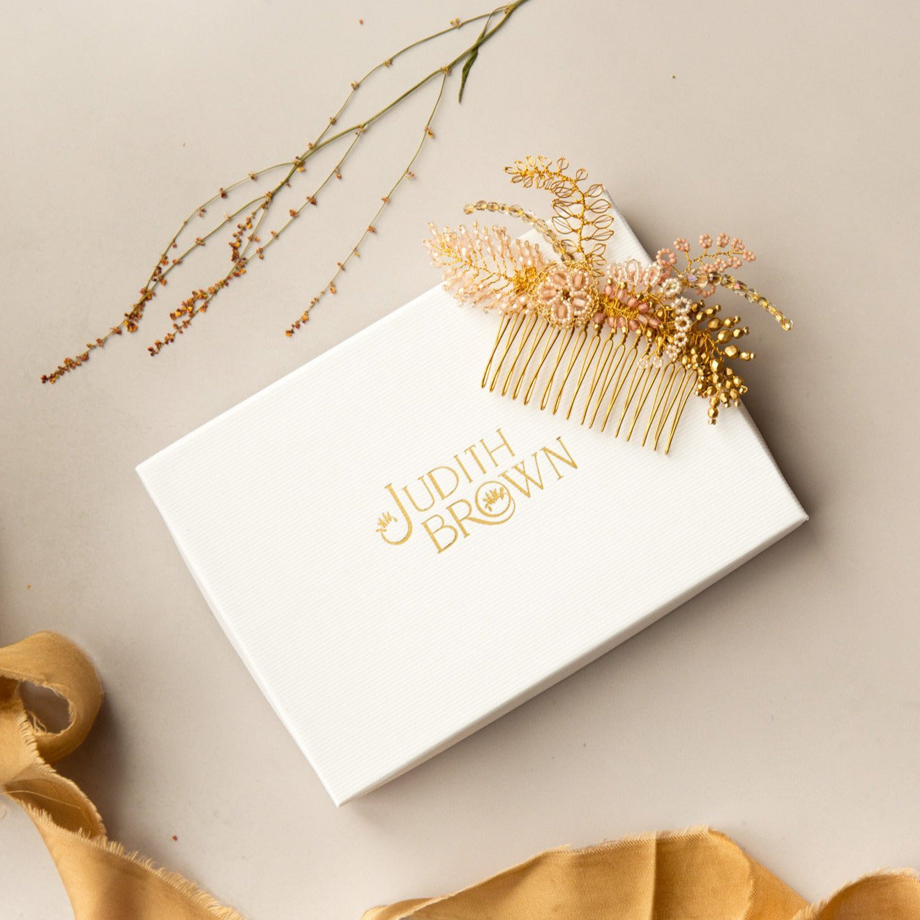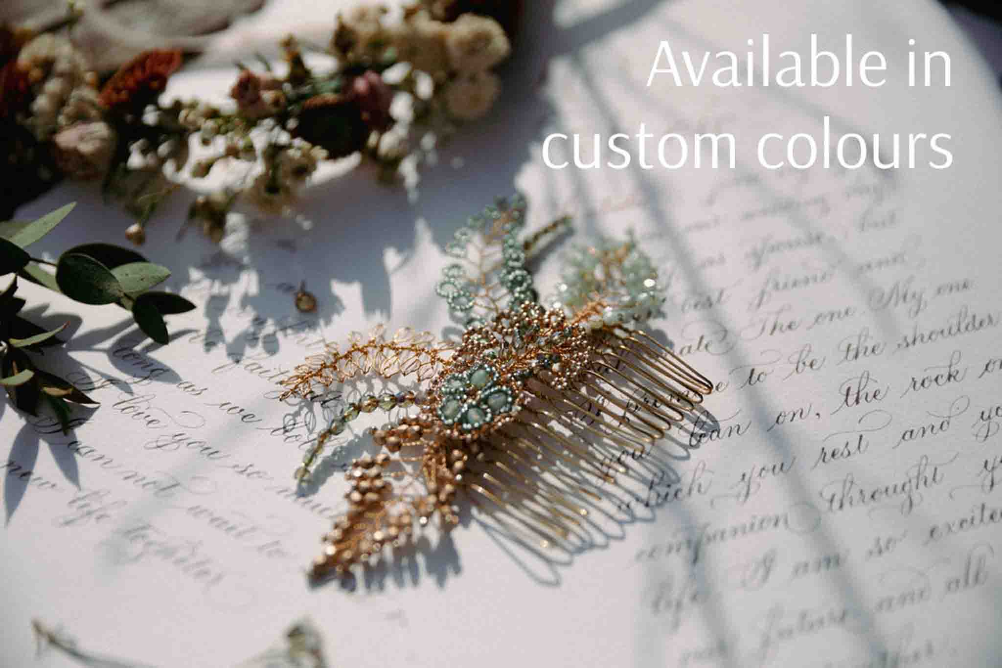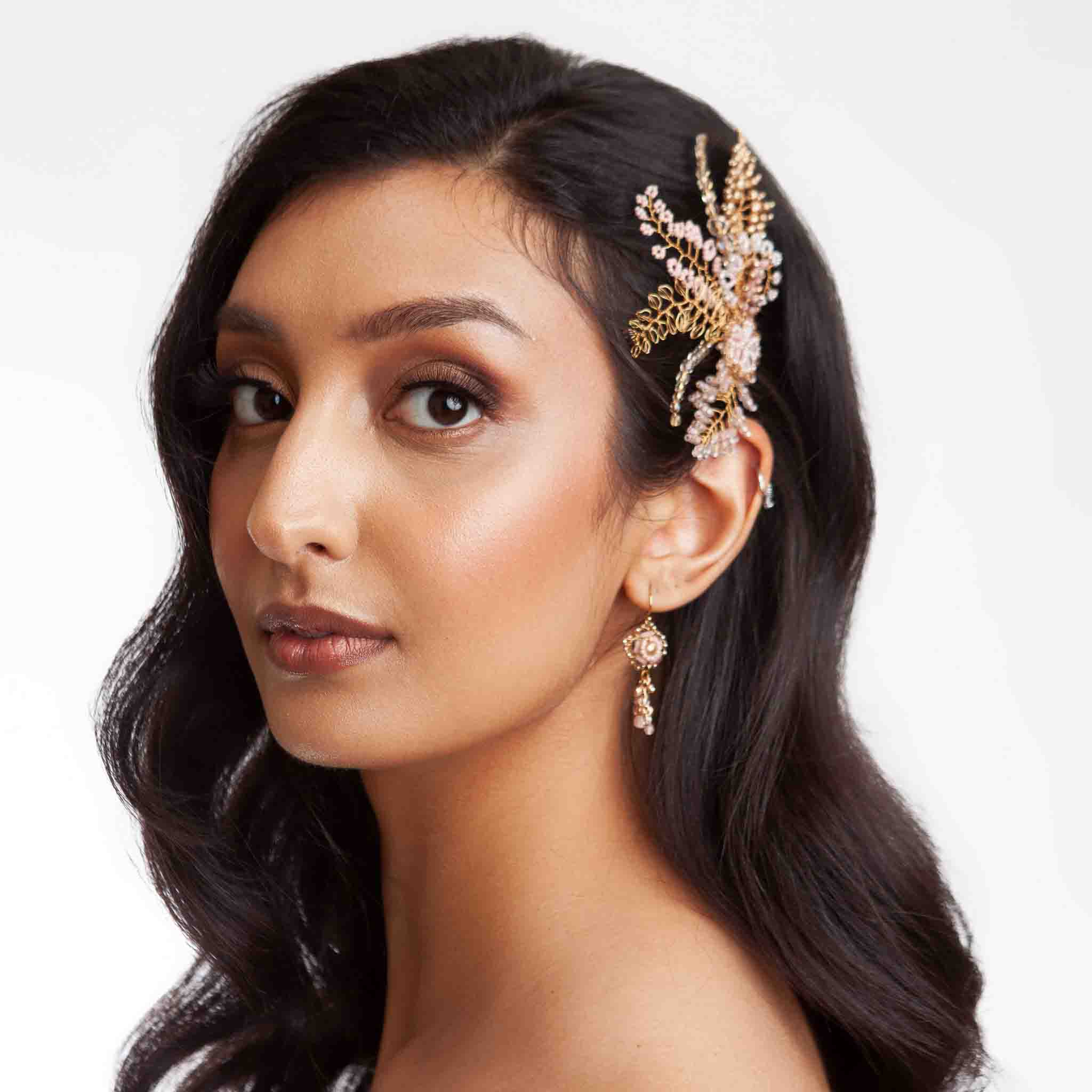 An intricate wedding hair comb in shades of blush and gold. This delicate hair accessory features handmade wire leaves and hand beaded fronds, put together in an organic style reminiscent of wildflowers and leaves growing together in a hedgerow.