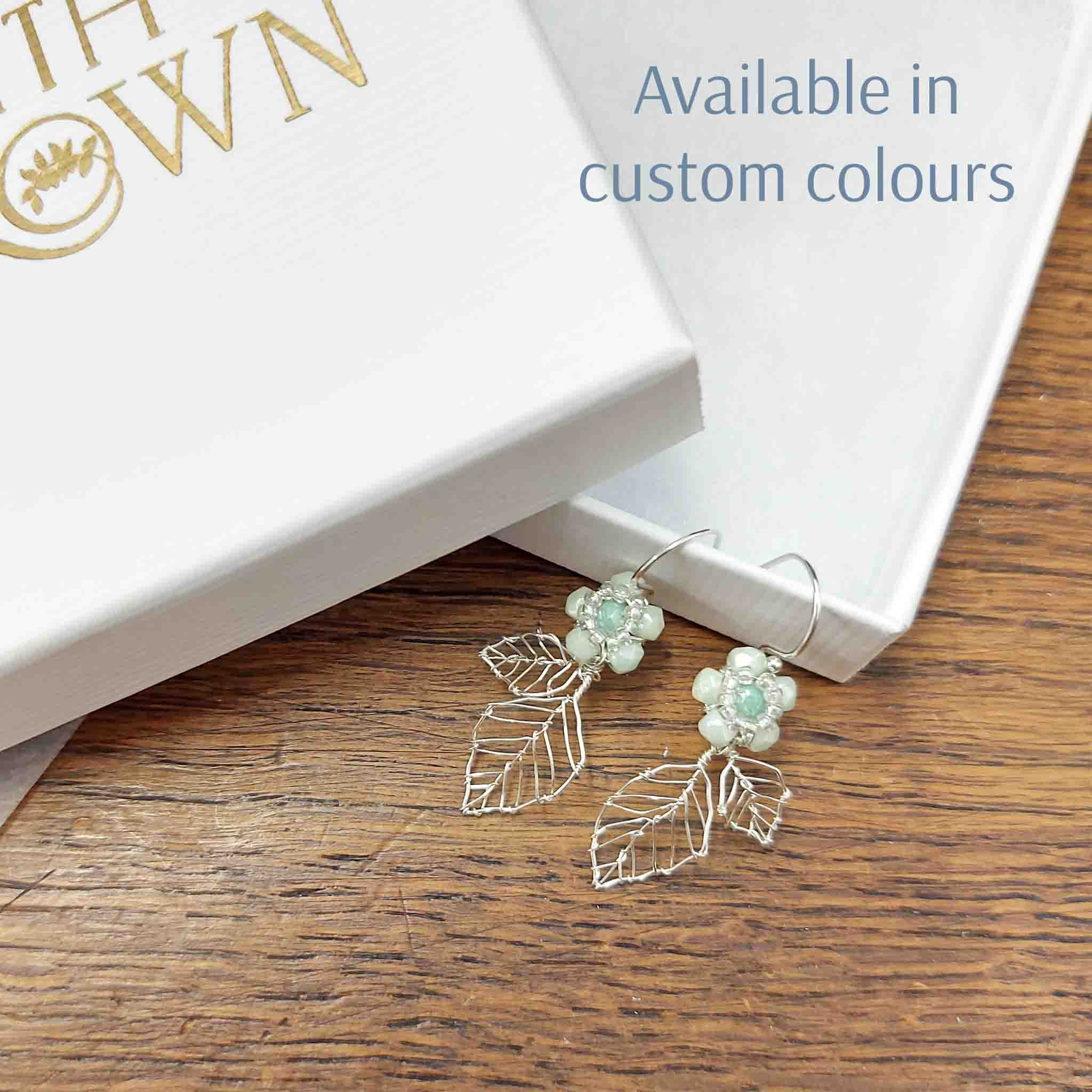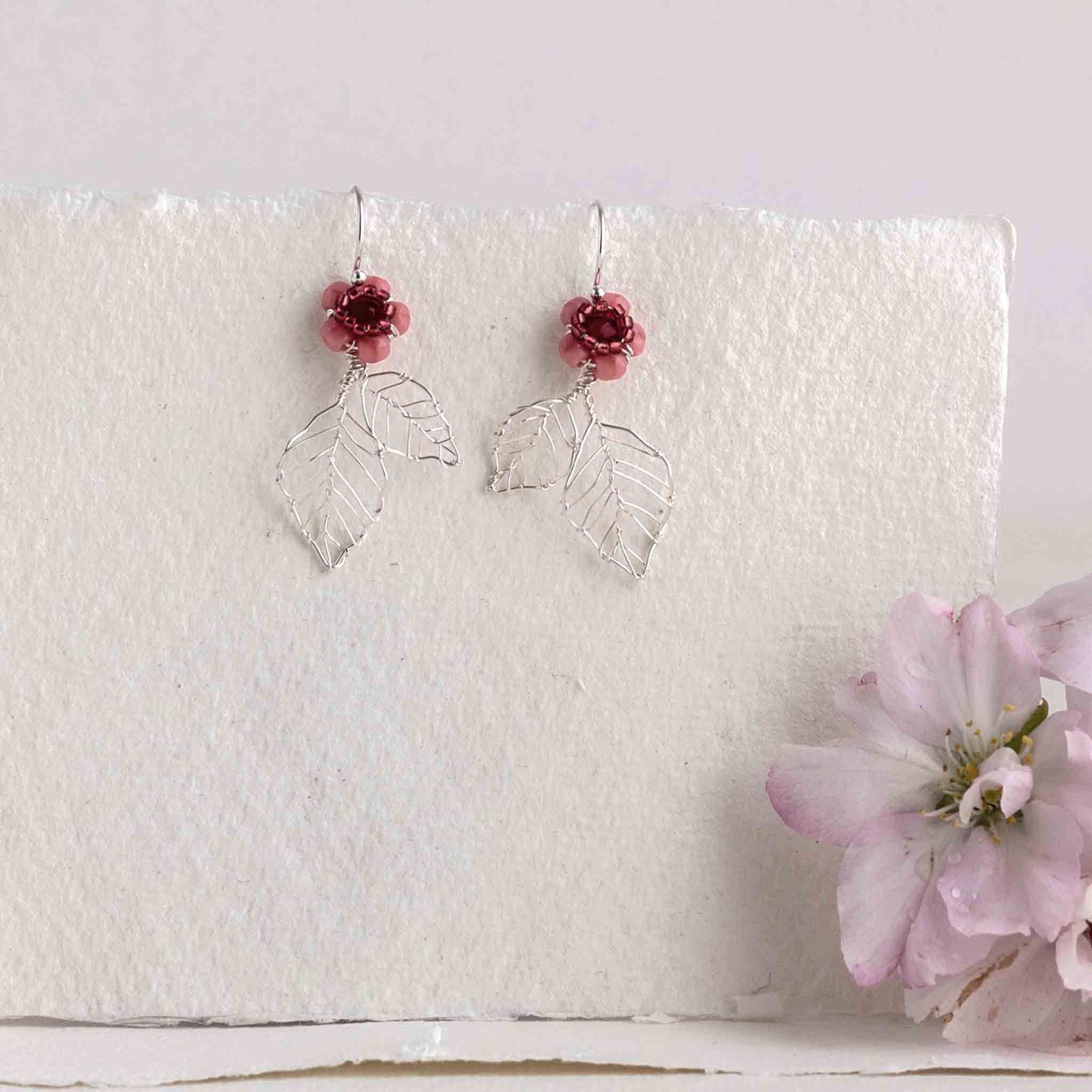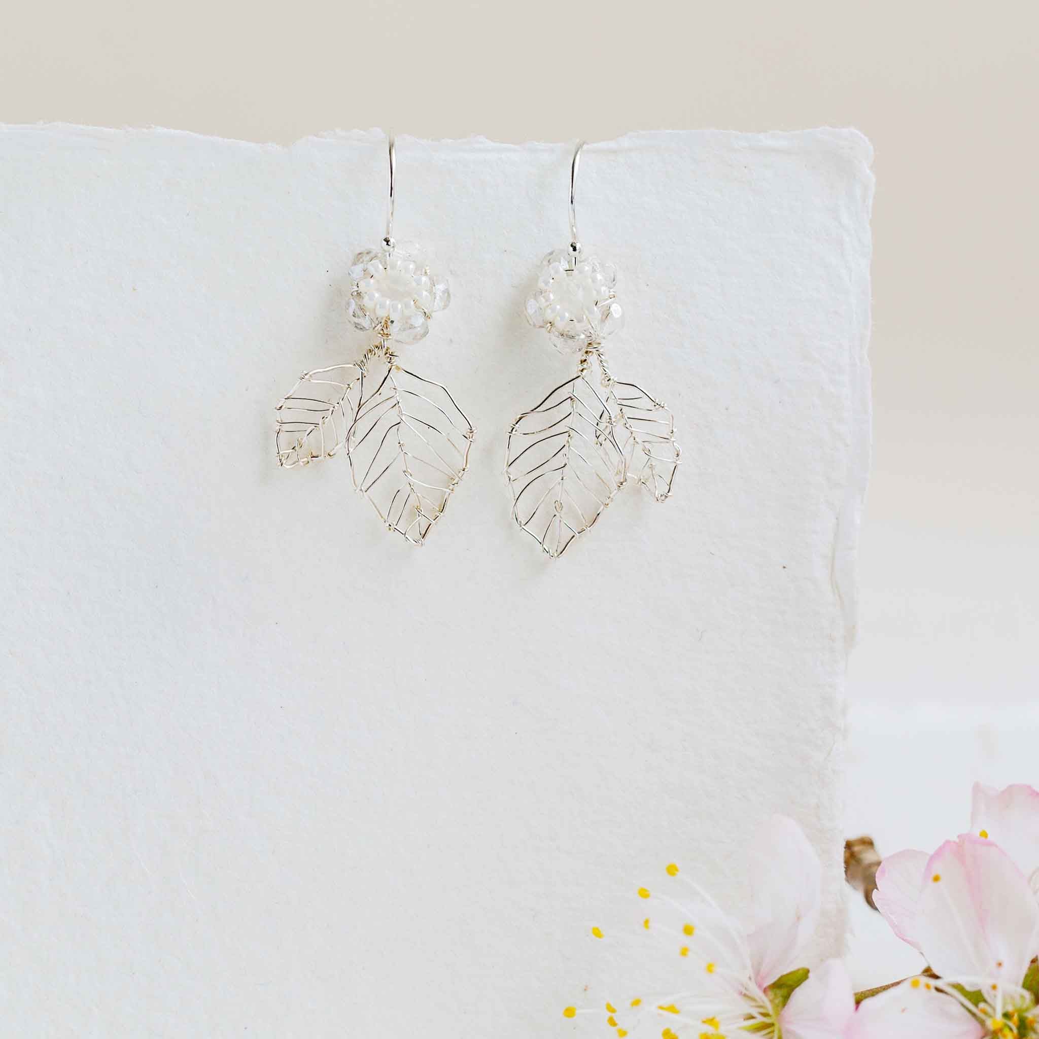 Handmade wedding earrings in silver wire, embellished with handmade wire leaves and tiny beaded flowers.