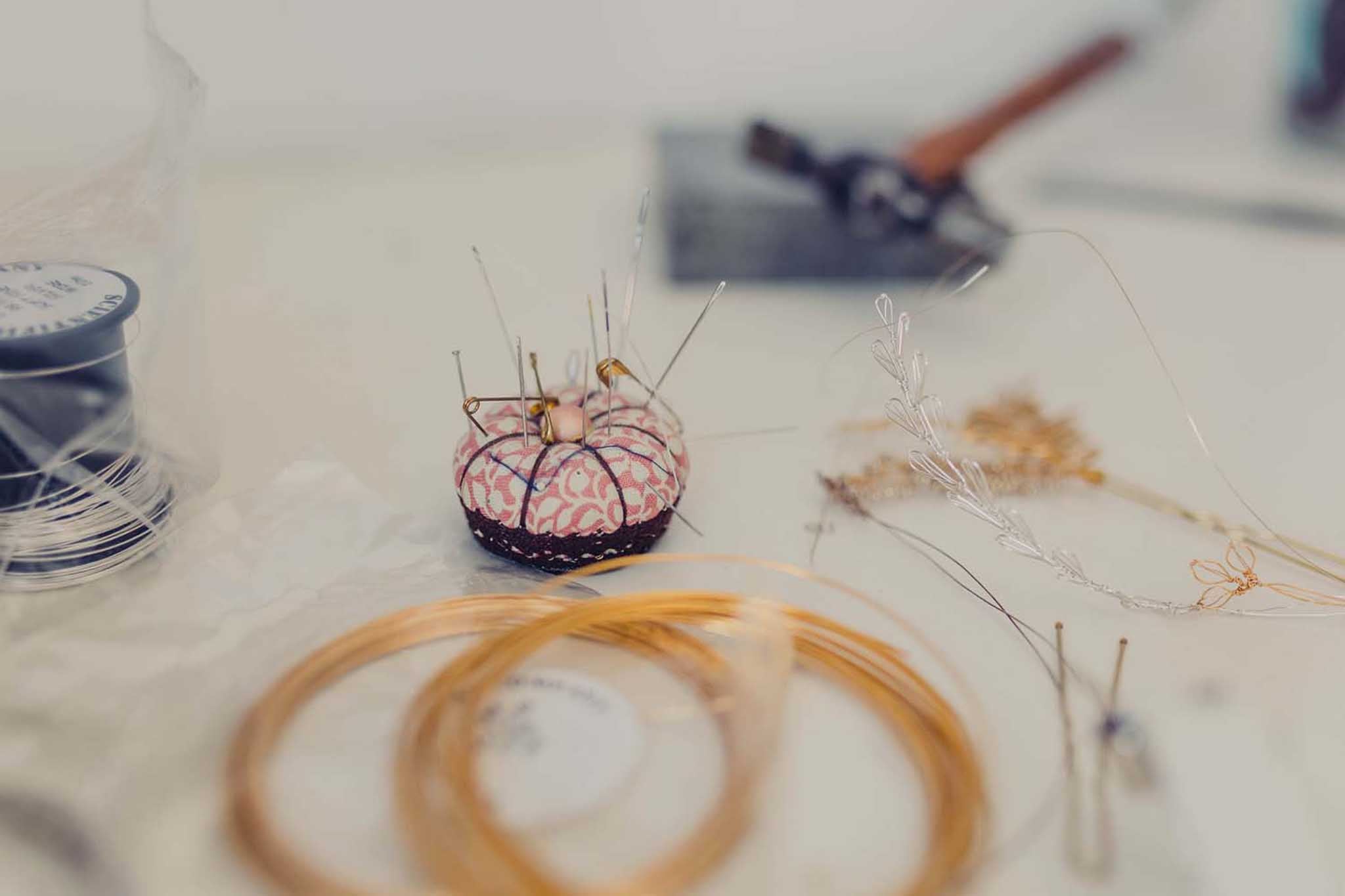 As part of the process we’ll look at your dress, your wedding theme and your style and we'll narrow down your inspiration into a concept. I’ll make notes and perhaps some rough sketches during our appointment. We can look at my vast collection of beads, wires and pearls, for colours and textures, later I can also source others to suit your design too, if I don’t have exactly the right thing.